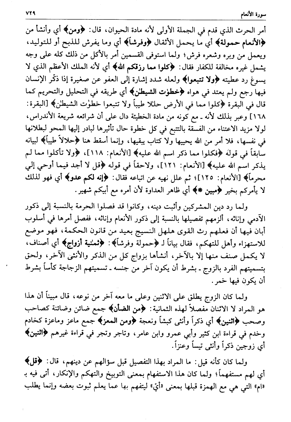 ولما رد دين المشركين وأثبت دينه ، وكانوا قد فصلوا الحرمة بالنسبة إلى ذكور الآدمي وإناثه ، ألزمهم تفصيلها بالنسبة إلى ذكور الأنعام وإناثه ، ففصل أمرها في أسلوب أبان فيها أن فعلهم رث القوى هلهل النسيج بعيد من قانون الحكمة ، فهو موضع للاستهزاء وأهل للتهكم ، فقال بياناً ل ) حمولة وفرشاً ( ) ثمانية أزواج ) أي أصناف ، لا يكمل صنف منها غلا بالآخر ، أنشأها بزواج كل من الذكر والأنثى الآخر ، ولحق بتسميتهم الفرد بالزوج - بشرط أن يكون آخر من جنسه - تسميتهم الزجاجة كأساً بشرط أن يكون فيها خمر .