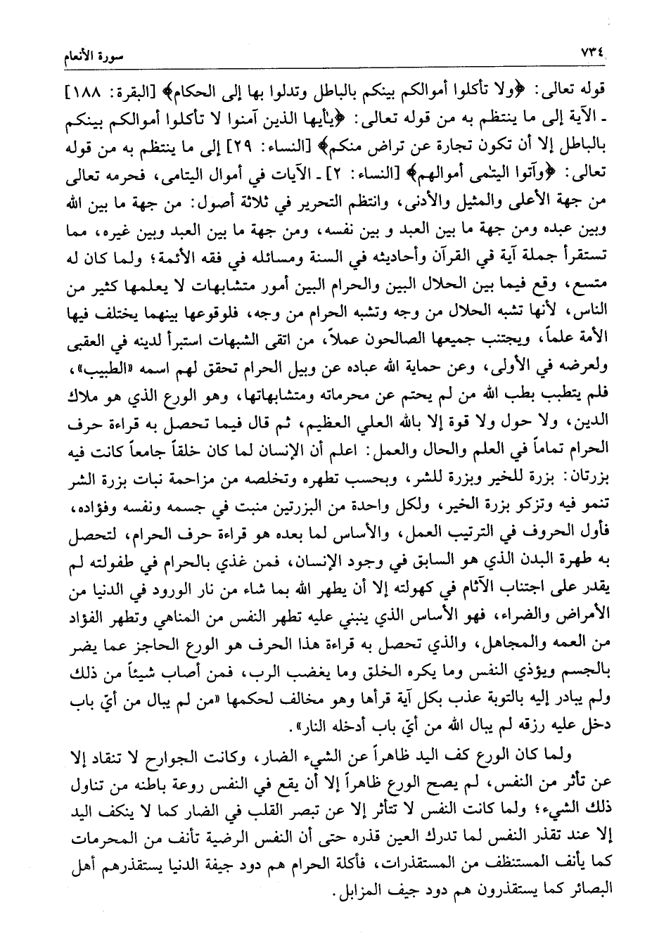 [ النسا : 2 ] - الآيات في أموال اليتامى ، فحرمه تعالى من جهة الأعلى والمثيل والأدنى ، وانتظم التحرير في ثلاثة أصول : من جهة ما بين الله وبين عبده ومن جهة ما بين العبد وبين نفسه ، ومن جهة ما بين العبد وبين غيره ، مما تستقرأ جملة آية في القرآن وأحاديثه في السنة ومسائله في فقه الأئمة ؛ ولما كان له متسع ، وقع فيما بين الحلال البين والحرام البين أمور متشابهات لا يعلمها كثير من الناس ، لأنها تشبه الحلال من وجه وتشبه الحرام من وجه ، فلوقوعها بينهما يختلف فيها ولعرضه في الأولى ، وعن حماية الله عباده عن وبيل الحرام تحقق لهم اسمه ( الطيب ) ، فلم يتطبب بطب الله من لم يحتم عن محرماته ومتشابهاتها ، وهو الورع الذي هو ملاك الدين ، ولا حول ولا قوة إلا بالله العلي العظيم ، ثم قال فيما تحصل به قراءة حرف الحرام تماماً في العلم والحال والعمل : اعلم أن الإنسان لما كان خلقاً جامعاً كانت فيه بزرتان : بزرة للخير وبزرة للشر ، وبحسب تطهره وتخلصه من مزاحمة نبات بزرة الشر تنمو فيه وتزكو بزرة الخير ، ولكل واحدة من البزرتين منبت في جسمه ونفسه وفؤاده ، فأول الحروف في الترتيب العمل ، والأساس لما بعده هو قراءة حرف الحرام ، لتحصل به طهرة البدن الذي هو السابق في وجود الإنسان فمن غذي بالحرام في طفولته لم يقدر على اجتناب الآثام في كهولته إلا أن يطهر الله بما شاء من نار الورود في الدنيا من الأمراض والضراء ، فهو الأساس الذي ينبني عليه تطهر النفس من المناهي وتطهر الفؤاد من العمه والمجاهل ، والذي تحصل به قراءة هذا الحرف هو الورع الحاجز عما يضر بالجسم ويؤذي النفس وما يكره الخلق وما يغضب الرب ، فمن أصاب شيئاً من ذلك ولم يبادر إليه بالتوبة عذب بكل آية قرأها وهو مخالف لحكمها ( من لم يبال من أيّ باب دخل عليه رزقه لم يبال الله من أيّ باب أدخله النار ) .