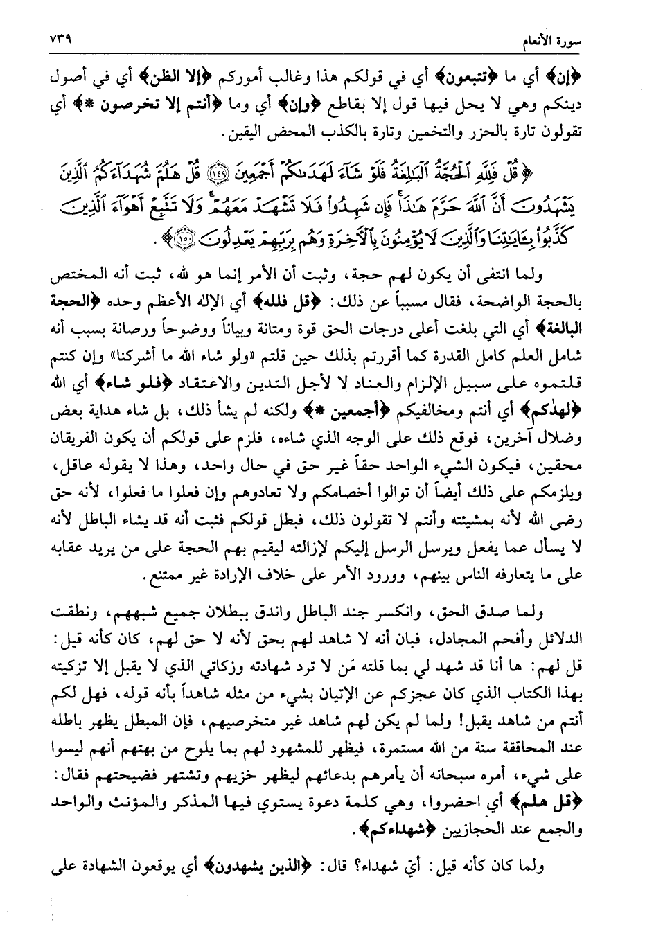 ) قُلْ فَلِلَّهِ الْحُجَّةُ الْبَالِغَةُ فَلَوْ شَآءَ لَهَدَاكُمْ أَجْمَعِينَ قُلْ هَلُمَّ شُهَدَآءَكُمُ الَّذِينَ يَشْهَدُونَ أَنَّ اللَّهَ حَرَّمَ هَذَا فَإِن شَهِدُواْ فَلاَ تَشْهَدْ مَعَهُمْ وَلاَ تَتَّبِعْ أَهْوَآءَ الَّذِينَ كَذَّبُواْ بِآيَاتِنَا وَالَّذِينَ لاَ يُؤْمِنُونَ بِالآخِرَةِ وَهُم بِرَبِّهِمْ يَعْدِلُونَ ( ( )