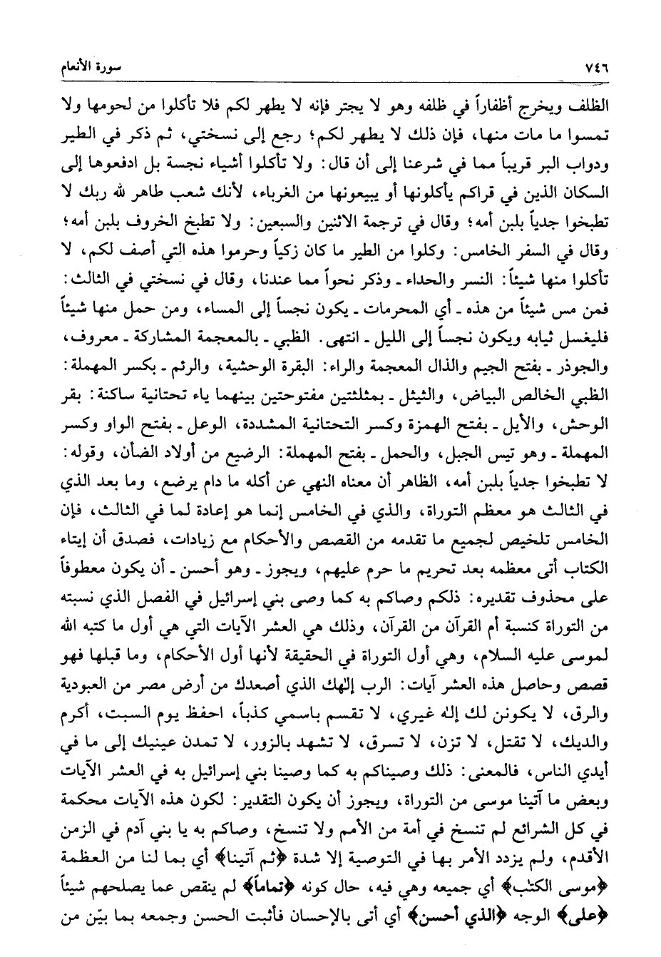 الظبي - بالمعجمة المشاركة - معروف ، والجوذر - بفتح الجيم والذال المعجمة والراء : البقرة الوحشية ، والرئم - بكسر المهملة : الظبي الخالص البياض ، والثيثل - بمثلثتين مفتوحتين بينهما ياء تحتانية ساكنة : بقر الوحش ، والأيل - بفتح الهمزة وكسر التحتانية المشددة ، الوعل - بفتح الواو وكسر المهملة - وهو تيس الجبل ، والحمل - بفتح المهملة : الرضيع من أولاد الضأن ، وقوله : لا تطبخوا جدياً بلبن أمه ، الظاهر أن معناه النهي عن أكله ما دام يرضع ، وما بعد الذي في الثالث هو معظم التوراة ، والذي في الخامس إنما هو إعادة لما في الثالث ، فإن الخامس تلخيص لجميع ما تقدمه من القصص والأحكام مع زيادات ، فصدق أن إيتاء الكتاب أتى معظمه بعد تحريم ما حرم عليهم ، ويجوز - وهو أحسن - أن يكون معطوفاً على محذوف تقديره : ذلكم وصاكم به كما وصى بني إسرائيل في الفصل الذي نسبته من التوراة كنسبة أم القرآن من القرآن ، وذلك هي العشر الآيات التي هي أول ما كتبه الله لموسى عليه السلام ، وهي أول التوراة في الحقيقة لأنها أول الأحكام ، وما قبلها فهو قصص وحاصل هذه العشر آيات : الرب إلهك الذي أصعدك من أرض مصر من العبودية والرق ، لا يكونن لك إله غيري ، لا تقسم باسمي كذباً ، احفظ يوم السبت ، أكرم والديك ، لا تقتل ، لا تزن ، لا تسرق ، لا تشهد بالزور ، لا تمدن عينيك إلى ما في أيدي الناس ، فالمعنى : ذلك وصيناكم به كما وصينا بني إسرائيل به في العشر الآيات وبعض ما آتينا موسى من التوراة ، ويجوز أن يكون التقدير : لكون هذه الآيات محكمة في كل الشرائع لم تنسخ في أمة من الأمم ولا تنسخ ، وصاكم به يا بني آدم في الزمن الأقدم ، ولم يزدد الأمر بها في التوصية إلا شدة ) ثم آتينا ) أي بما لنا من العظمة ) موسى الكتاب ) أي جميعه وهي فيه ، حال كونه ) تماماً ( لم ينقص عما يصلحهم شيئاً ) على ( الوجه ) الذي أحسن ) أي أتى بالإحسان فأثبت الحسن وجمعه بما بيّن من
