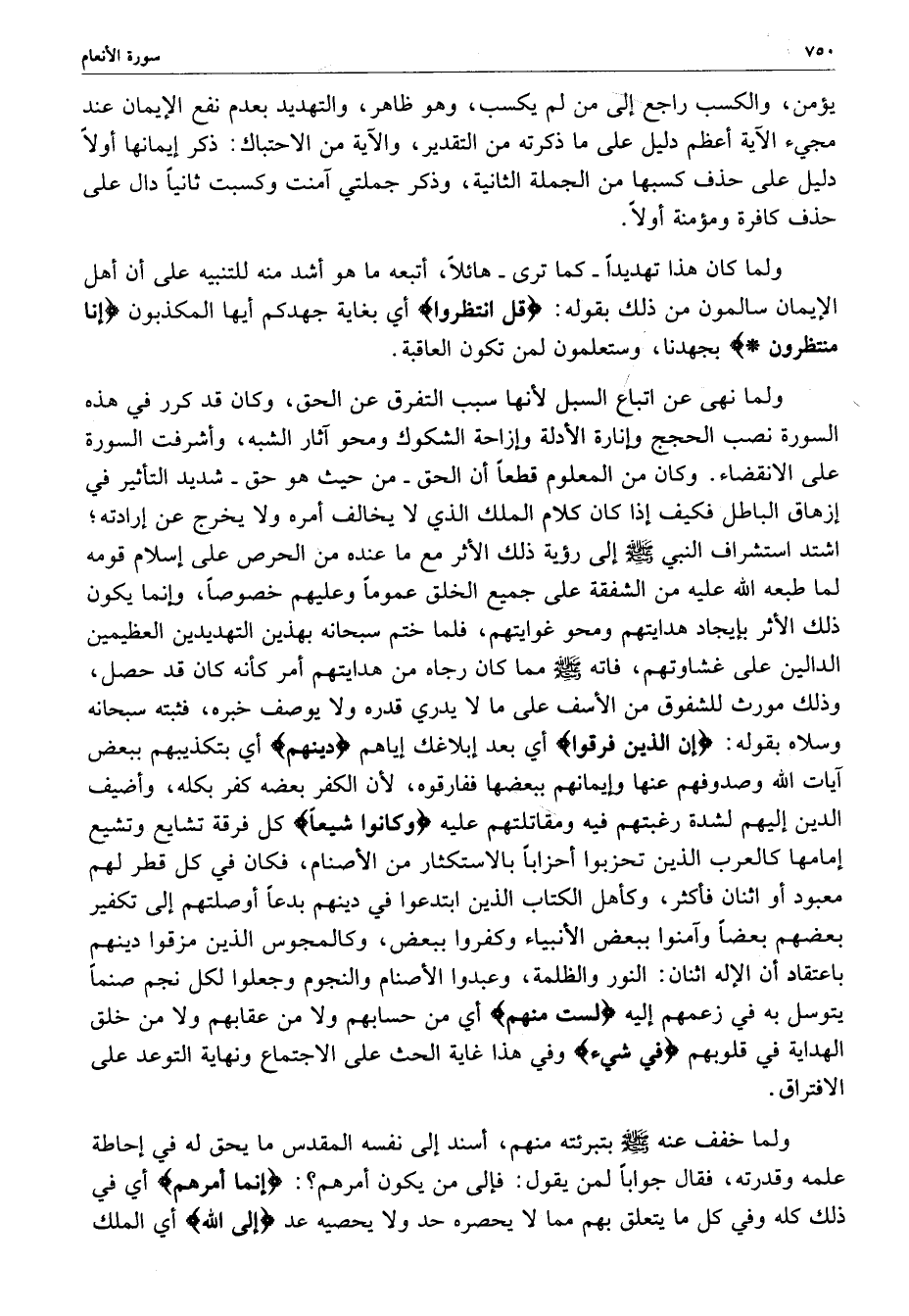 وكان من المعلوم قطعاً أن الحق - من حيث هو حق - شديد التأثير في إزهاق الباطل فكيف إذا كان كلام الملك الذي لا يخالف أمره ولا يخرج عن إرادته ؛ اشتد استشراف النبي ( صلى الله عليه وسلم ) إلى رؤية ذلك الأثر مع ما عنده من الحرص على إسلام قومه لما طبعه الله عليه من الشفقة على جميع الخلق عموماً وعليهم خصوصاً ، وإنما يكون ذلك الأثر بإيجاد هدايتهم ومحو غوايتهم ، فملا ختم سبحانه بهذين التهديدين العظيمين الدالين على غشاوتهم ، فإنه ( صلى الله عليه وسلم ) مما كان رجاه من هدايتهم أمر كأنه كان قد حصل ، وذلك مورث للشفوق من الأسف على ما لا يدري قدره ولا يوصف خبره ، فثبته سبحانه وسلاه بقوله : ( إن الذين فرقوا ) أي بعد إبلاغك إياهم ) دينهم ) أي بتكذيبهم ببعض آيات الله وصدوفهم عنها وإيمانهم ببعضها ففارقوه ، لأن الكفر بعضه كفر بكله ، وأضيف الدين إليهم لشدة رغبتهم فيه ومقاتلتهم عليه ) وكانوا شيعاً ( كل فرقة تشايع وتشيع إمامها كالعرب الذين تحزبوا أحزاباً بالاستكثار من الأصنام ، فكان في كل قطر لهم معبود أو اثنان فأكثر ، وكأهل الكتاب الذين ابتدعوا في دينهم بدعاً أوصلتهم إلى تكفير بعضهم بعضاً وآمنوا ببعض الأنبياء وكفروا ببعض ، وكالمجوس الذين مزقوا دينهم باعتقاد أن الإله اثنان : النور والظلمة ، وعبدوا اًنام والنجوم وجعلوا لكل نجم صنماً يتوسل به في زعمهم إليه ) لست منهم ) أي من حسابهم ولا من عقابهم ولا من خلق الهداية في قلوبهم ) في شيء ( وفي هذا غاية الحث على الاجتماع ونهاية التوعد على الافتراق .