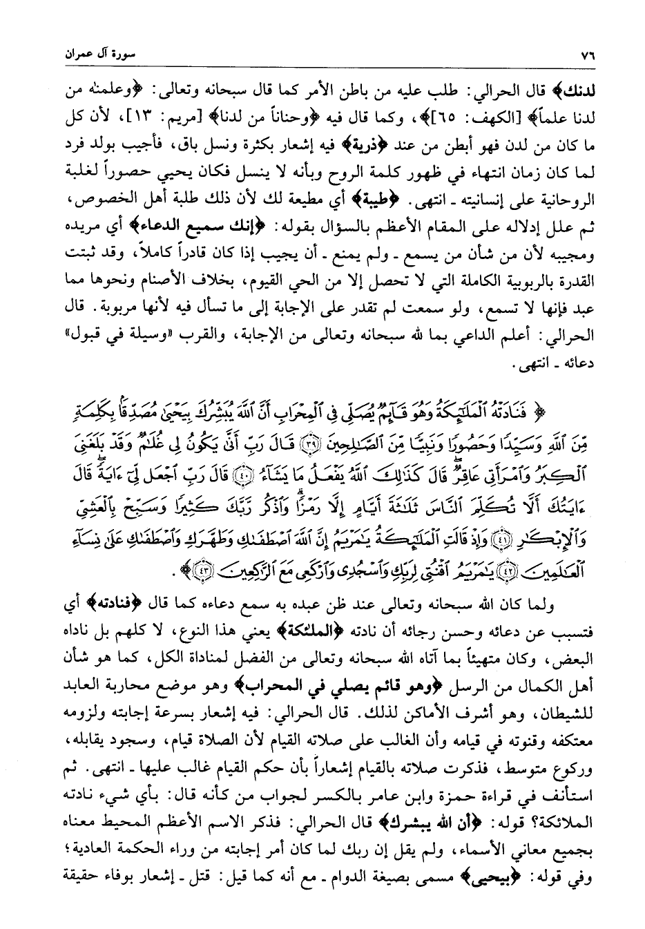 ) فَنَادَتْهُ الْمَلائِكَةُ وَهُوَ قَائِمٌ يُصَلِّي فِي الْمِحْرَابِ أَنَّ اللَّهَ يُبَشِّرُكَ بِيَحْيَى مُصَدِّقاً بِكَلِمَةٍ مِّنَ اللَّهِ وَسَيِّداً وَحَصُوراً وَنَبِيّاً مِّنَ الصَّالِحِينَ قَالَ رَبِّ أَنَّى يَكُونُ لِي غُلاَمٌ وَقَدْ بَلَغَنِي الْكِبَرُ وَامْرَأَتِي عَاقِرٌ قَالَ كَذَلِكَ اللَّهُ يَفْعَلُ مَا يَشَآءُ قَالَ رَبِّ اجْعَلْ لِّي آيَةً قَالَ آيَتُكَ أَلاَّ تُكَلِّمَ النَّاسَ ثَلاَثَةَ أَيَّامٍ إِلاَّ رَمْزاً وَاذْكُر رَّبَّكَ كَثِيراً وَسَبِّحْ بِالْعَشِيِّ وَالإِبْكَارِ وَإِذْ قَالَتِ الْمَلاَئِكَةُ يمَرْيَمُ إِنَّ اللَّهَ اصْطَفَاكِ وَطَهَّرَكِ وَاصْطَفَاكِ عَلَى نِسَآءِ الْعَالَمِينَ يمَرْيَمُ اقْنُتِي لِرَبِّكِ وَاسْجُدِي وَارْكَعِي مَعَ الرَّاكِعِينَ ( ( )