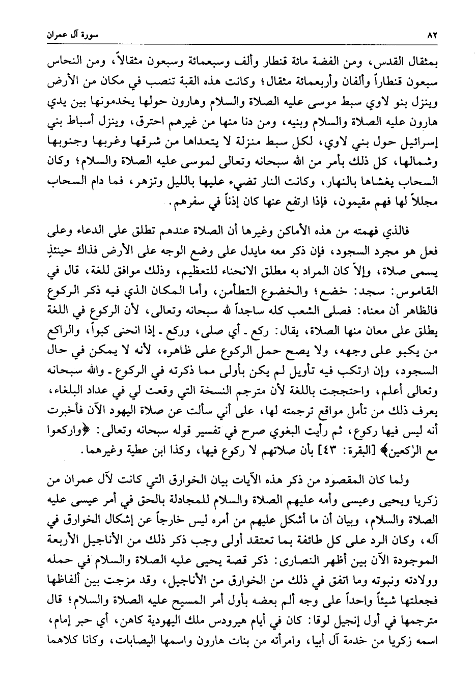فالذي فهمته من هذه الأماكن وغيرها أن الصلاة عندهم تطلق على الدعاء وعلى فعل هو مجرد السجود ، فإن ذكر معه ما يدل على وضع الوجه على الأرض فذاك حينئذٍ يسمى صلاة ، وإلاّ كان المراد به مطلق الانحناء للتعظيم ، وذلك موافق للغة ، قال في القاموس : سجد : خضع ؛ والخضوع التطأمن ، وأما المكان الذي فيه ذكر الركوع فالظاهر أن معناه : فصلى الشعب كله ساجداً لله سبحانه وتعالى ، لأن الركوع في اللغة يطلق على معان مناه الصلاة ، يقال : ركع - أي صلى ، وركع - إذا انحنى كبواً ، والراكع من يكبو على وجهه ، ولا يصح حمل الركوع على ظاهره ، لأنه لا يمكن في حال السجود ، وإن ارتكب فيه تأيول لم يكن بأولى مما ذكرته في الركوع - والله سبحانه وتعالى أعلم ، واحتججت باللغة لأن مترجم النسخة التي وقعت لي في عداد البلغاء ، يعرف ذلك من تأمل مواقع ترجمته لها ، على أني سألت عن صلاة اليهود الآن فأخبرت أنه ليس فيها ركوع ، ثم رأيت البغوي صرح في تفسير قوله سبحانه وتعالى :