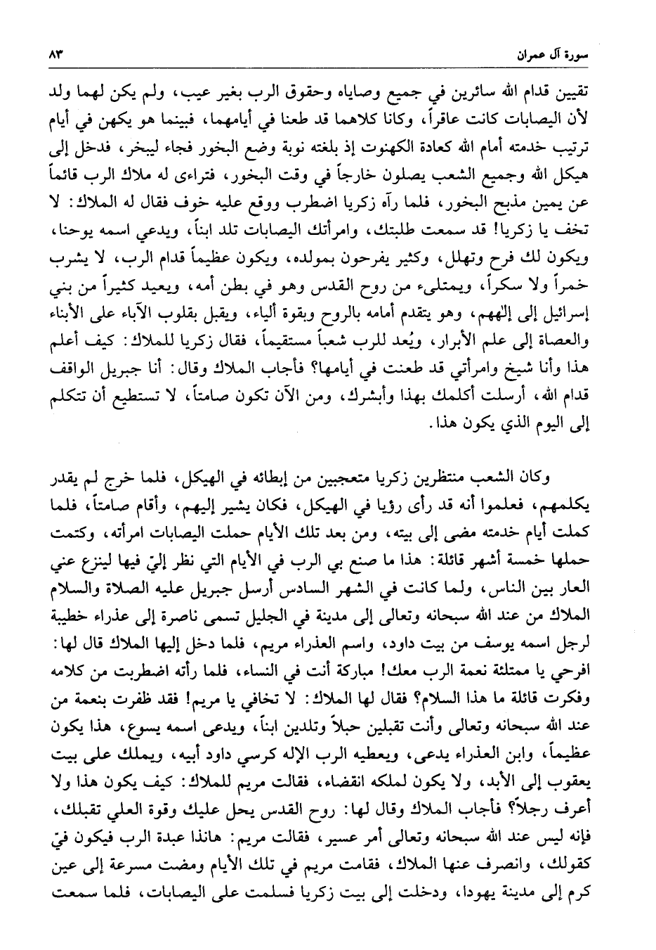 تقيين قدام الله سائرين ي جميع وصاياه وحقوق الرب بغير عيب ، ولم يكن لهما ولد لأن اليصابات كانت عاقراً ، وكانا كلاهما قد طعنا في أيامهما ، فبينما هو يكهن في أيام ترتيب خدمته أما الله كعادة الكهنوت إذ بلغته نوبة وضع البخور فجاء ليبخر ، فدخل إلأى هيكل الله وجميع الشعب يصلون خارجاً في وقت البخور ، فتراءى له ملاك الرب قائماً عن يمين مذبح البخور ، فلام رآه زكريا اضطرب ووقع عليه خوف فقال له الملاك : لا تخف يا زكريا قد مسعت طلبتك ، وأمرأتك اليصابات تلد ابناً ، ويدعي اسمه يوحنا ، ويكون لك فرح وتهلل ، وكثير يفرحون بمولده ، يوكون عظيماً قدام الرب ، لا يشرب خمراً ولا سكراً ، ويمتلىء من روح القدس وهو في بطن أمه ، ويعيد كثيراً من بني إسرائيل إلى إلههم ، وهو يتقدم أمامه بالروح وبقوة الياء ، ويقبل بقلوب الآباء على الأبناء والعصاة إلى علم الأبرار ، ويُعد للرب شعباً مستقيماً ، فقال زكريا للملاك : كيف أعلم هذا وأنا شيخ وامرأتي قد طعنت في أيامها ؟ فأجاب الملاك وقال : أنا جبريل الواقف قدام الله ، أرسلت أكلمك بهذا وأبشرك ، ومن الآن تكون صامتاً ، لا تستطيع أن تتكلم إلى اليوم الذي يكون هذا .