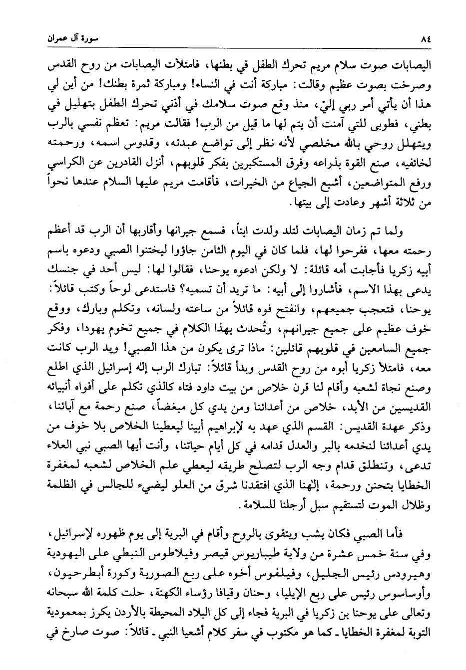 فأما الصبي فكان يشب ويتقوى بالروح وأقام في البرية إلى يوم ظهوره لإسرائيل ، وفي سنة خمس عشرة من ولاية طيباريوس قيصر وفيلاطوس النبطي على اليهودية وهيرودس رئيس الجليل ، وفيلوس أخوه على ربع الصورية وكورة أبطر حيون وأوساسوس رئيس على ربع الإيليا ، وحنان وقيافا رؤساء الكهنة ، حلت كلمة الله سبحانه وتعالى على يوحنا بن زكريا في البرية فجاء إلى كل البلاد المحيطة بالأردن يكرز بمعمودية التوبة لمغفرة الخطايا - كا هو مكتوب فس سفر كلام أشعيا النبي - قائلاً : صورت صارخ في