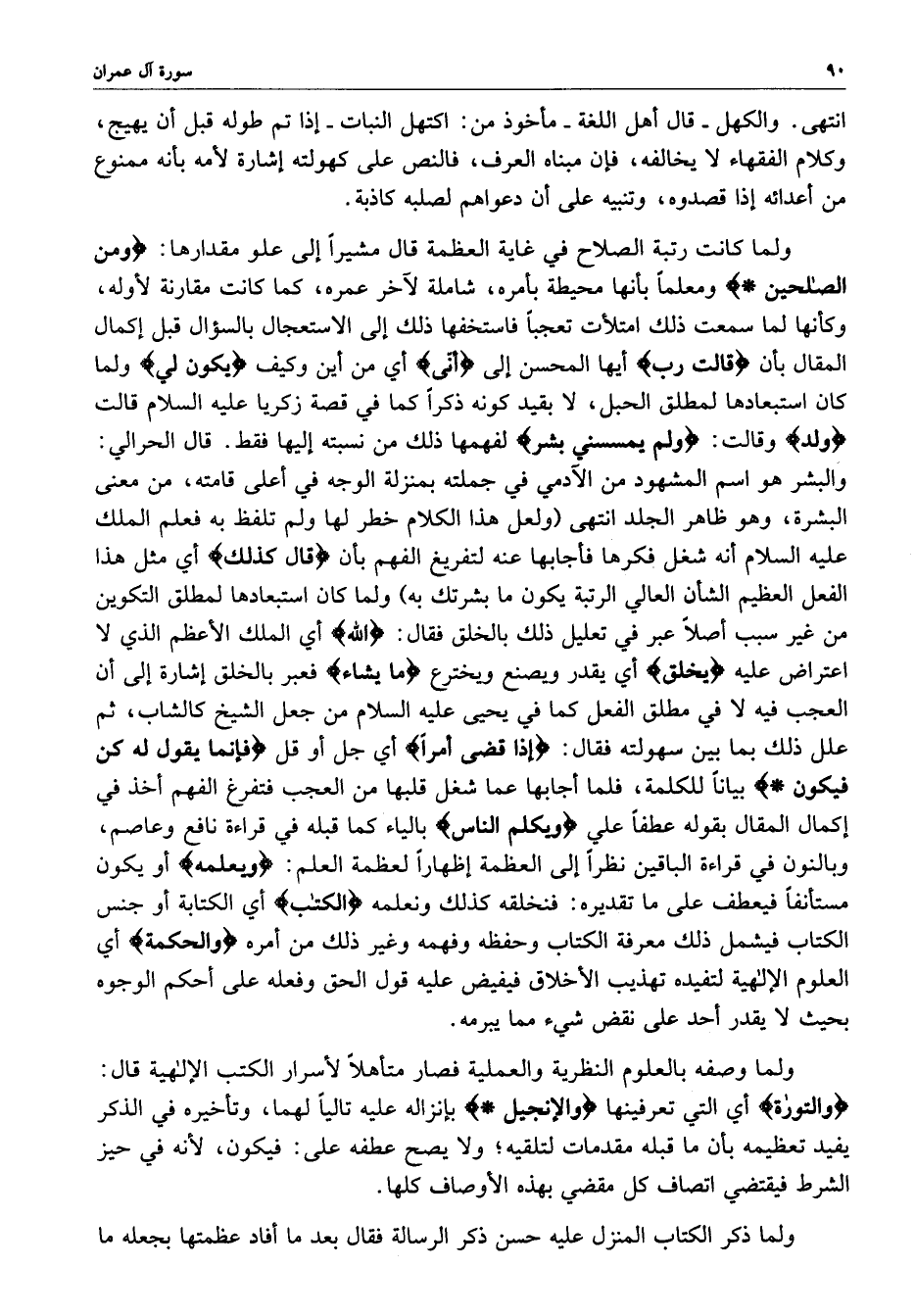 قال الحرالي : والبشر هو اسم المشهود من الآدمي في جملته بمنزلة الوجه في أعلى قامته ، من معنى البشرة ، وهو ظاهر لاجلد انتهى ( ولعل هذا الكلام خطر لها ولم تلفظ به فعلم الملك عليه لاسلام أنه شغل فكرها فأجابها عنه لتفريغ الفهم بأن ) قال كذلك ) أي مثل هذا الفعل العظيم الشأن العالم الرتبة يكون ما بشرتك به ) ولما كان استبعادها لمطلق التكوين من غير سبب أصلاً عبر في تعليل ذلك بالخلق فقال : ( الله ) أي الملك الأعظم الذي لا اعتراض عليه ) يخلق ) أي يقدر ويصنع ويخترع ) ما يشاء ( فعبر بالخلق إشارة إلى أن العجب فيه لا في مطلق الفعل كما في يحيى عليه السلام من حعل الشيخ كالشاب ، ثم علل ذلك لبما بين سهولته فقال : ( اذا قضى أمراً ) أي جل أو قل ) فإنما يقول له كن فيكون ( بياناً للكلمة ، فلما أجابها عما شغل قلبها من العجب فتفرغ الفهم أخذ في إكمال المقال بقوله عطفاً علي ) ويكلم الناس ( بالياء كما قبله في قراءة نافع وعاصم ، وبالنون في قراءة الباقين نظراً إلى العظمة إظهاراً لعظمة العلم : ( ويعلمه ( أو يكون الكتاب فيشمل ذلك معرفة الكتاب وحفظه وفهمه وغير ذلك من امره ) والحكمة ) أي العلوم الإلهية لتفيده تهذيب الأخلاق فيفيض عليه قول الحق وفعله على أحكم الوجوه بحيث لا يقدر أحد على نقض شيء مما يبرمه .