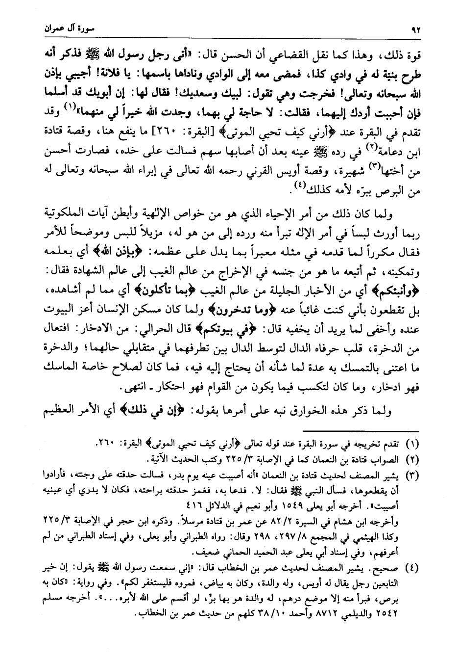 [ البقرة : 260 ] ما ينفع هنا ، وقصة قتادة ابن دعامة في رده ( صلى الله عليه وسلم ) عينه بعد أن أصابها سهم فسالت على خده ، فصارت أحسن من أختها شهيرة ، وقصة أويس القرني رحمه الله تعالى في إبراه الله سبحانه وتعالى له من البرص ببرّه لأمه كذلك .