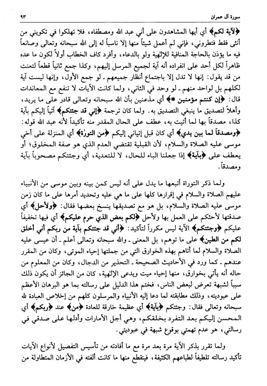 ولما ذكر التوراة أتبعها ما يدل على أنه ليس كمن بينه وبين موسى من الأنبياء عليهم الصلاة والسلام في إقرارها كلها على ما هي عليه وتحديد أمرها على ما كان زمن موسى عليه الصلاة والسلامن بل هو مع تصديقها ينسخ بعضها فقال : ( ولأحل ) أي صدقتها لأحثكم على العمل بها ولأحل ) لكم بعض الذي حرم عليكم ) أي فيها تخفيفاً عليكم ) وجئتكم ( آية ليس مكرراً لتأكيد : ( أني قد جئتكم بآية من ربكم أني أخلق لكم من الطين ( على ما توهم ، بل المعنى - والله سبحانه وتعالى أعلم - أن عيسى عليه الصلاة والسلام لما أتاهم بهذه الخوارف التي من جملتها إحياء الموتى ، وكان من المقرر عندهم - كما ورد في الأحاديث الصحيحة - التحذير من الدحال ، وكان من المعلوم من حاله أنه يأتي بخوارق ، منها إحياء ميت ويدعى الإلهية ، كان من الجائز أن يكون ذلك سبباً لشبهة تعرض لبعض الناس ، فختم هذا الدليل على رسالته بما هو البرهان الأعظم على عبوديته ، وذلك مطابقته لما دعا إليه الأنياء والمرسلون كلهم من إخلاص العبادة لله سبحانه وتعالى فقال : وجئتكم ) بآية ) أي عظيمة خارقة للعادة ) من ( عند ) ربكم ) أي المحسن إليكم بعد التفرد بخلقكم ، وهي أجل الأمارات وأدلها على صدقي في رسالتي ، هو عدم تهمتي بوقوع شبهة في عبوديتي .