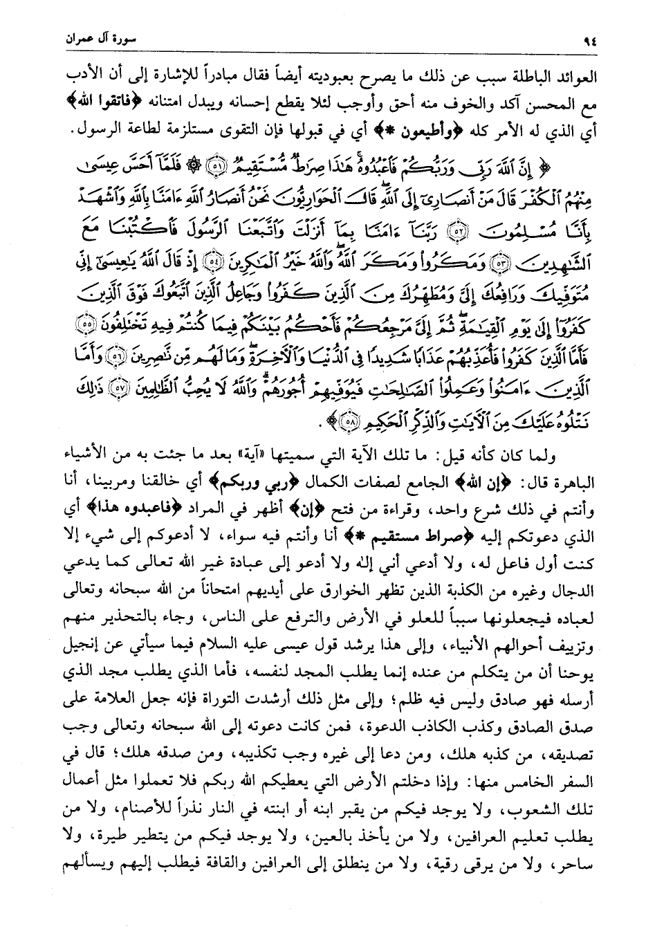 ) إِنَّ اللَّهَ رَبِّي وَرَبُّكُمْ فَاعْبُدُوهُ هَذَا صِرَاطٌ مُّسْتَقِيمٌ فَلَمَّآ أَحَسَّ عِيسَى مِنْهُمُ الْكُفْرَ قَالَ مَنْ أَنصَارِي إِلَى اللَّهِ قَالَ الْحَوَارِيُّونَ نَحْنُ أَنْصَارُ اللَّهِ آمَنَّا بِاللَّهِ وَاشْهَدْ بِأَنَّا مُسْلِمُونَ رَبَّنَآ آمَنَّا بِمَآ أَنزَلَتْ وَاتَّبَعْنَا الرَّسُولَ فَاكْتُبْنَا مَعَ الشَّاهِدِينَ وَمَكَرُواْ وَمَكَرَ اللَّهُ وَاللَّهُ خَيْرُ الْمَاكِرِينَ إِذْ قَالَ اللَّهُ يعِيسَى إِنِّي مُتَوَفِّيكَ وَرَافِعُكَ إِلَيَّ وَمُطَهِّرُكَ مِنَ الَّذِينَ كَفَرُواْ وَجَاعِلُ الَّذِينَ اتَّبَعُوكَ فَوْقَ الَّذِينَ كَفَرُواْ إِلَى يَوْمِ الْقِيَامَةِ ثُمَّ إِلَيَّ مَرْجِعُكُمْ فَأَحْكُمُ بَيْنَكُمْ فِيمَا كُنتُمْ فِيهِ تَخْتَلِفُونَ فَأَمَّا الَّذِينَ كَفَرُواْ فَأُعَذِّبُهُمْ عَذَاباً شَدِيداً فِي الدُّنْيَا وَالآخِرَةِ وَمَا لَهُمْ مِّن نَّاصِرِينَ وَأَمَّا الَّذِينَ آمَنُوا وَعَمِلُواْ الصَّالِحَاتِ فَيُوَفِّيهِمْ أُجُورَهُمْ وَاللَّهُ لاَ يُحِبُّ الظَّالِمِينَ ذلِكَ نَتْلُوهُ عَلَيْكَ مِنَ الآيَاتِ وَالذِّكْرِ الْحَكِيمِ ( ( )