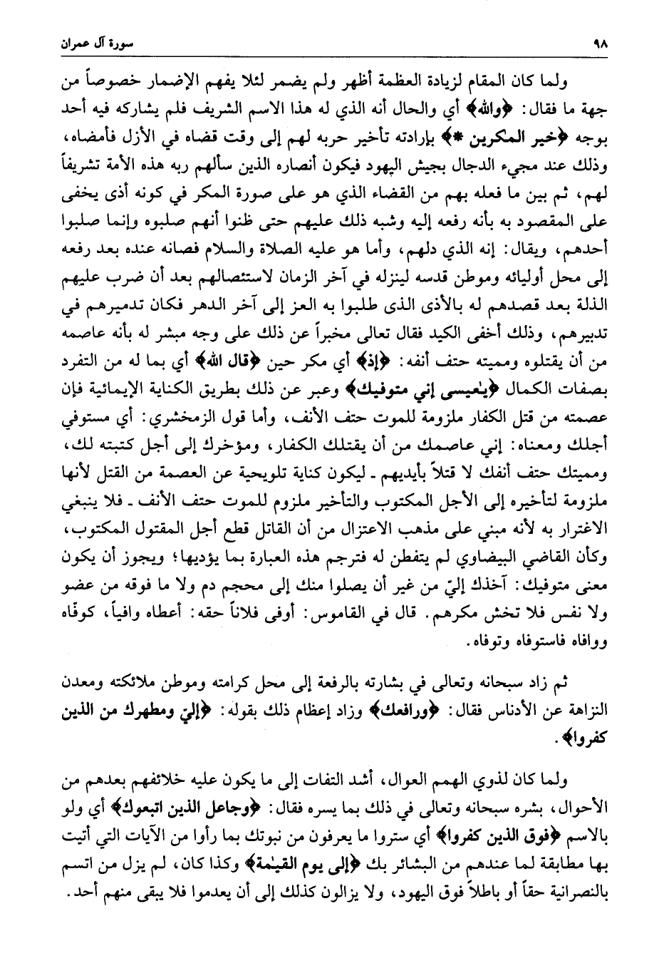 ولما كان المقام لزيادة العظمة أظهر ولم يضمر لئلا يفهم الإضمار خصوصاً من جهة ما فقال : ( والله ) أي والحال أنه الذي له هذا الاسم الشريف فلم يشاركه فيه أحد وذلك عند مجيء الدجال بجيش اليهود فيكون أنصاره الذين سألهم ربه هذه الأمة تشريفاً لهم ، ثم ين ما فعله بهم من القضاء الذي هو على صورة المكر في كونه أذى يخفى على المقصود به بأنه رفعه إليه وشبه ذلك عليهم حتى ظنوا أنهم صلبوه وإنما صلبوه أحدهم ، ويقال : إنه الذي دلهم ، وأما هو عليه الصلاة والسلام فصانه عنده بعد رفعه إلى محل أوليائه وموطن قدسه لينزله في آخر الزمان لاستئصالهم بعد أن ضرب عليهم الذلة بعد قصدهم له بالأذى الذى طلبوا به العز إلى آخر الدهر فكان تدميرهم في تدبيرهم ، وذلك أخفى الكيد فقال تعالى مخبراً عن ذلك على وجه مبشر له بأنه عاصمه من أن يقتلوه ومميته حتف أنفه : ( إذ ) أي مكر حين ) قال الله ) أي ما له من التفرد بصفات الكمال ) ياعيسى إني متوفيك ( وعبر عن ذلك بطريق الكناية الإيمائية فإن عصمته من قتل الكفار ملزومة للموت حتف الأنف ، وأما قول الزمخشري : أي مستوفى أجلك ومعناه : إني عاصمك من أن يقتلك الكفار ، ومؤخرك إلى أجل كتبته لك ، ومميتك حتف أنفك لا قتلاً بأيديهم - ليكون كناية تلويحية عن العصمة من القتل لأنها ملزومة لتأخيره إلى الأجل المكتوب والتأخير ملزوم للموت حتف الأنف - فلا ينبغي الاغترار به لأنه مبني على مذهب الاعتزال من أن القاتل قطع أجل المقتول المكتوب ، وكأن القاضي البيضاوي لم يتفطن له فترجم هذه العبارة بما يؤديها ؛ ويجوز أن يكون معنى متوفيك : آخذك إليّ من غير أن يصلوا منك إلى محجم دم ولا ما فوقه من عضو ولا نفس فلا تخش مكرهم .
