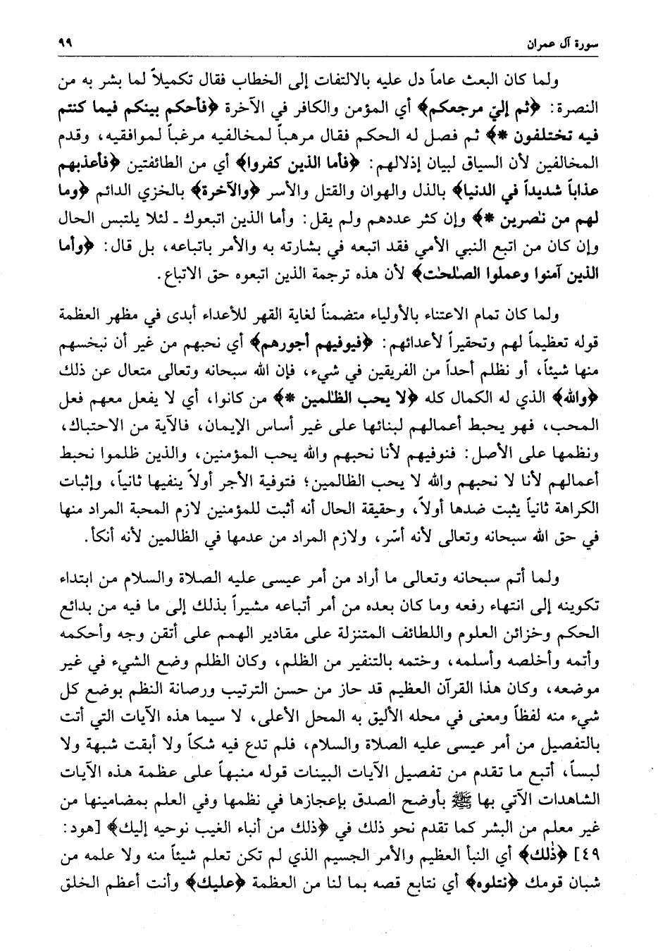 ولما كان تمام الاعتناء بالأولياء متضمناً لغاية القهر للأعداء أبدى في مظهر العظمة قوله تعظيماً لهم وتحقيراً لأعدائهم : ( فيوفيهم أجورهم ) أي نحبهم من غير أ ، نبخسهم ) والله ( الذي له الكمال كله ) لا يحب الظالمين ( من كانوا ، أي لا يفعل معهم فعل المحب ، فهو يحبط أعمالهم لبنائها على غير أساس الإيمان ، فالآية من الاحتباك ، ونظمها على الأصل : فنوفيهم لأنا نحبهم والله يحب المؤمنين ، والذين ظلموا نحبط أعمالهم لأنا لا نحبهم والله لا يحب الظالمين ؛ فتوفية الأجر أولاً ينفيها ثانياً ، وإثبات الكراهة ثانياً يثبت ضدها أولاً ، وحقيقة الحال أنه أثبت للمؤمنين لازم المحبة المراد منها في حق الله سبحانه وتعالى لأنه أسّر ، ولازم المراد من عدمها في الظالمين لأنه أنكأ .
