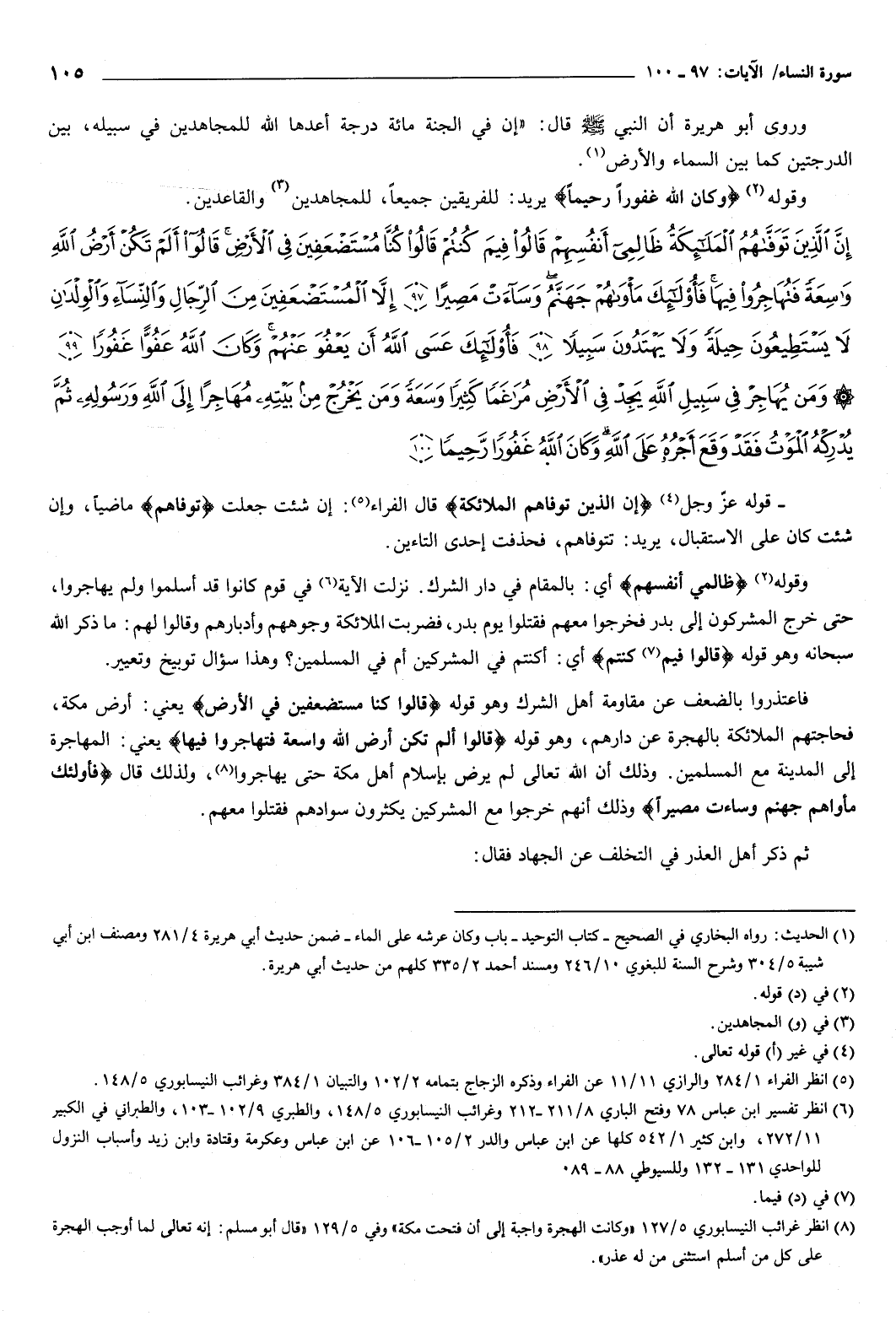 {إِنَّ الَّذِينَ تَوَفَّاهُمُ الْمَلائِكَةُ ظَالِمِي أَنْفُسِهِمْ قَالُوا فِيمَ كُنْتُمْ قَالُوا كُنَّا مُسْتَضْعَفِينَ فِي الأَرْضِ قَالُوا أَلَمْ تَكُنْ أَرْضُ اللَّهِ وَاسِعَةً فَتُهَاجِرُوا فِيهَا فَأُولَئِكَ مَأْوَاهُمْ جَهَنَّمُ وَسَاءَتْ مَصِيرًا {97} إِلا الْمُسْتَضْعَفِينَ مِنَ الرِّجَالِ وَالنِّسَاءِ وَالْوِلْدَانِ لا يَسْتَطِيعُونَ حِيلَةً وَلا يَهْتَدُونَ سَبِيلا {98} فَأُولَئِكَ عَسَى اللَّهُ أَنْ يَعْفُوَ عَنْهُمْ وَكَانَ اللَّهُ عَفُوًّا غَفُورًا {99} وَمَنْ يُهَاجِرْ فِي سَبِيلِ اللَّهِ يَجِدْ فِي الأَرْضِ مُرَاغَمًا كَثِيرًا وَسَعَةً وَمَنْ يَخْرُجْ مِنْ بَيْتِهِ مُهَاجِرًا إِلَى اللَّهِ وَرَسُولِهِ ثُمَّ يُدْرِكْهُ الْمَوْتُ فَقَدْ وَقَعَ أَجْرُهُ عَلَى اللَّهِ وَكَانَ اللَّهُ غَفُورًا رَحِيمًا {100} } قوله عز وجل: {إِنَّ الَّذِينَ تَوَفَّاهُمُ الْمَلائِكَةُ} [النساء: 97] قال الفراء: إن شئت جعلت: توفاهم ماضيا، وإن شئت كان على الاستقبال، يريد: تتوفاهم، فحذفت إحدى التاءين.