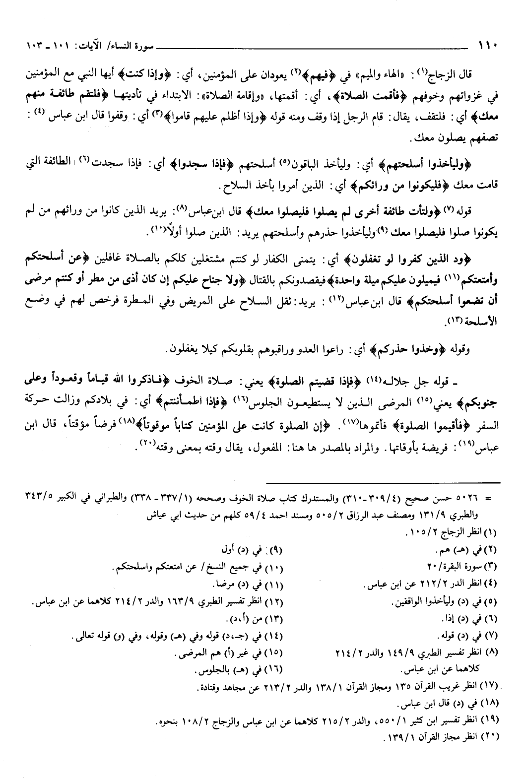قوله: {وَلْتَأْتِ طَائِفَةٌ أُخْرَى لَمْ يُصَلُّوا فَلْيُصَلُّوا مَعَكَ} [النساء: 102] قال ابن عباس: يريد: الذين كانوا من ورائهم من لم يكونوا صلوا فليصلوا معك، وليأخذوا حذرهم وأسلحتهم، يريد: الذين صلوا أولا.