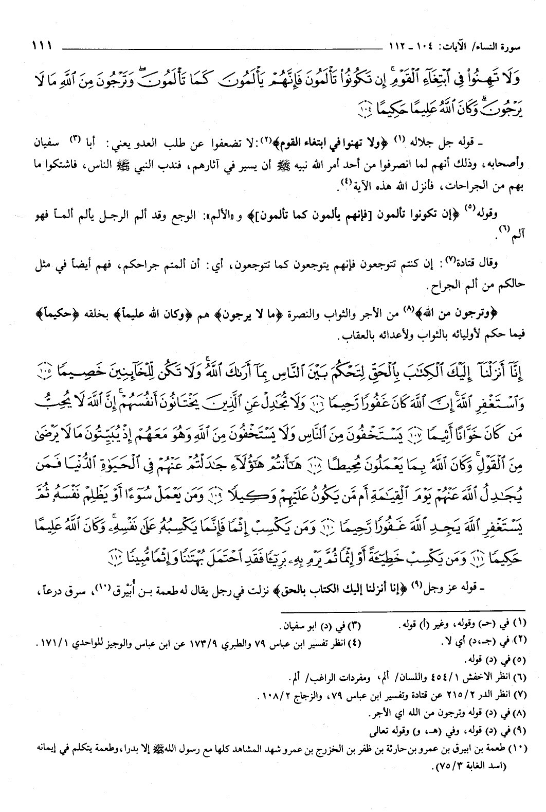 {إِنَّا أَنْزَلْنَا إِلَيْكَ الْكِتَابَ بِالْحَقِّ لِتَحْكُمَ بَيْنَ النَّاسِ بِمَا أَرَاكَ اللَّهُ وَلا تَكُنْ لِلْخَائِنِينَ خَصِيمًا {105} وَاسْتَغْفِرِ اللَّهَ إِنَّ اللَّهَ كَانَ غَفُورًا رَحِيمًا {106} وَلا تُجَادِلْ عَنِ الَّذِينَ يَخْتَانُونَ أَنْفُسَهُمْ إِنَّ اللَّهَ لا يُحِبُّ مَنْ كَانَ خَوَّانًا أَثِيمًا {107} يَسْتَخْفُونَ مِنَ النَّاسِ وَلا يَسْتَخْفُونَ مِنَ اللَّهِ وَهُوَ مَعَهُمْ إِذْ يُبَيِّتُونَ مَا لا يَرْضَى مِنَ الْقَوْلِ وَكَانَ اللَّهُ بِمَا يَعْمَلُونَ مُحِيطًا {108} هَأَنْتُمْ هَؤُلاءِ جَادَلْتُمْ عَنْهُمْ فِي الْحَيَاةِ الدُّنْيَا فَمَنْ يُجَادِلُ اللَّهَ عَنْهُمْ يَوْمَ الْقِيَامَةِ أَمْ مَنْ يَكُونُ عَلَيْهِمْ وَكِيلا {109} وَمَنْ يَعْمَلْ سُوءًا أَوْ يَظْلِمْ نَفْسَهُ ثُمَّ يَسْتَغْفِرِ اللَّهَ يَجِدِ اللَّهَ غَفُورًا رَحِيمًا {110} وَمَنْ يَكْسِبْ إِثْمًا فَإِنَّمَا يَكْسِبُهُ عَلَى نَفْسِهِ وَكَانَ اللَّهُ عَلِيمًا حَكِيمًا {111} وَمَنْ يَكْسِبْ خَطِيئَةً أَوْ إِثْمًا ثُمَّ يَرْمِ بِهِ بَرِيئًا فَقَدِ احْتَمَلَ بُهْتَانًا وَإِثْمًا مُبِينًا {112} } [النساء: 105-112] قوله عز وجل: {إِنَّا أَنْزَلْنَا إِلَيْكَ الْكِتَابَ بِالْحَقِّ} [النساء: 105] نزلت في رجل يقال له طعمة بن أبيرق، سرق درعا