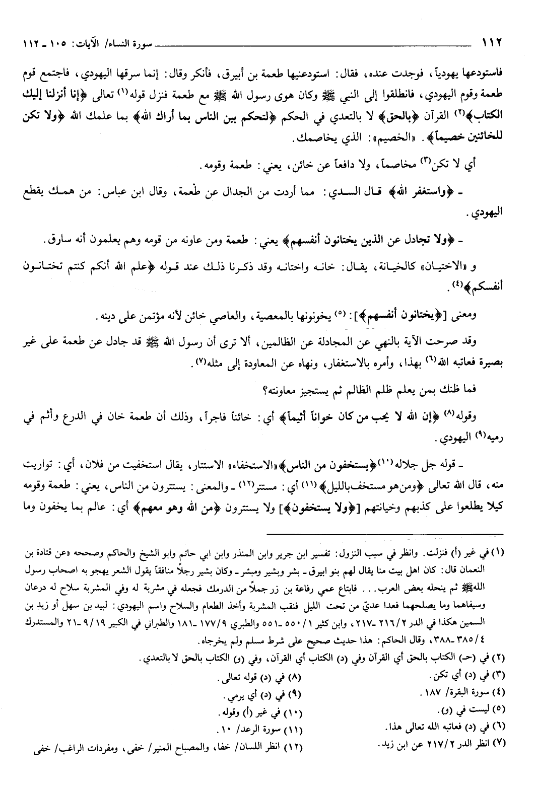 فاستودعها يهوديا، فوجدت عنده، فقال: استودعنيها طعمة بن أبيرق، فأنكر وقال: إنما سرقها اليهودي، فاجتمع قوم طعمة وقوم اليهودي، فانطلقوا إلى النبي صَلَّى اللهُ عَلَيْهِ وَسَلَّمَ، وكان هوى رسول الله صَلَّى اللهُ عَلَيْهِ وَسَلَّمَ مع طعمة، فنزل قوله تعالى: {إِنَّا أَنْزَلْنَا إِلَيْكَ الْكِتَابَ} [النساء: 105] القرآن، بالحق: لا بالتعدي في الحكم، {لِتَحْكُمَ بَيْنَ النَّاسِ بِمَا أَرَاكَ اللَّهُ} [النساء: 105] بما علمك الله، {وَلا تَكُنْ لِلْخَائِنِينَ خَصِيمًا} [النساء: 105] الخصيم: الذي يخاصمك.