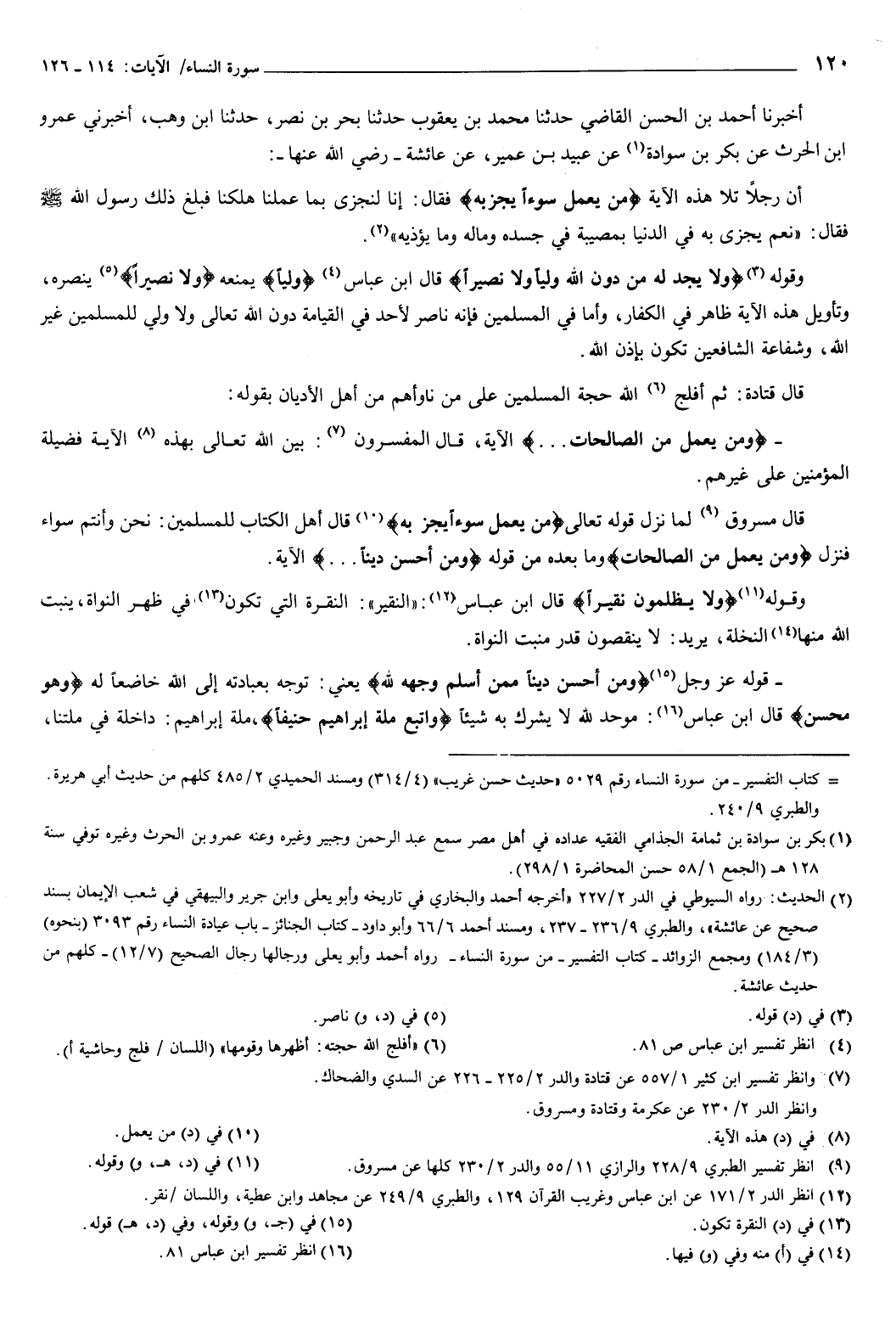 قال مسروق: لما نزل قوله تعالي: {مَنْ يَعْمَلْ سُوءًا يُجْزَ بِهِ} [النساء: 123] قال أهل الكتاب للمسلمين: نحن وأنتم سواء، فنزل: {وَمَنْ يَعْمَلْ مِنَ الصَّالِحَاتِ} [النساء: 124] وما بعده من قوله: {وَمَنْ أَحْسَنُ دِينًا} [النساء: 125] الآية.