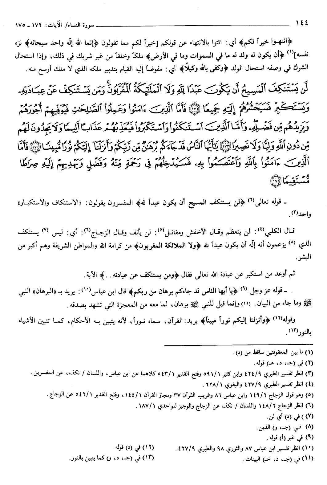 {لَنْ يَسْتَنْكِفَ الْمَسِيحُ أَنْ يَكُونَ عَبْدًا لِلَّهِ وَلا الْمَلائِكَةُ الْمُقَرَّبُونَ وَمَنْ يَسْتَنْكِفْ عَنْ عِبَادَتِهِ وَيَسْتَكْبِرْ فَسَيَحْشُرُهُمْ إِلَيْهِ جَمِيعًا {172} فَأَمَّا الَّذِينَ آمَنُوا وَعَمِلُوا الصَّالِحَاتِ فَيُوَفِّيهِمْ أُجُورَهُمْ وَيَزِيدُهُمْ مِنْ فَضْلِهِ وَأَمَّا الَّذِينَ اسْتَنْكَفُوا وَاسْتَكْبَرُوا فَيُعَذِّبُهُمْ عَذَابًا أَلُيمًا وَلا يَجِدُونَ لَهُمْ مِنْ دُونِ اللَّهِ وَلِيًّا وَلا نَصِيرًا {173} يَأَيُّهَا النَّاسُ قَدْ جَاءَكُمْ بُرْهَانٌ مِنْ رَبِّكُمْ وَأَنْزَلْنَا إِلَيْكُمْ نُورًا مُبِينًا {174} فَأَمَّا الَّذِينَ آمَنُوا بِاللَّهِ وَاعْتَصَمُوا بِهِ فَسَيُدْخِلُهُمْ فِي رَحْمَةٍ مِنْهُ وَفَضْلٍ وَيَهْدِيهِمْ إِلَيْهِ صِرَاطًا مُسْتَقِيمًا {175} } [النساء: 172-175] قوله تعالى: {لَنْ يَسْتَنْكِفَ الْمَسِيحُ أَنْ يَكُونَ عَبْدًا لِلَّهِ} [النساء: 172] المفسرون يقولون: الاستنكاف والاستكبار واحد.