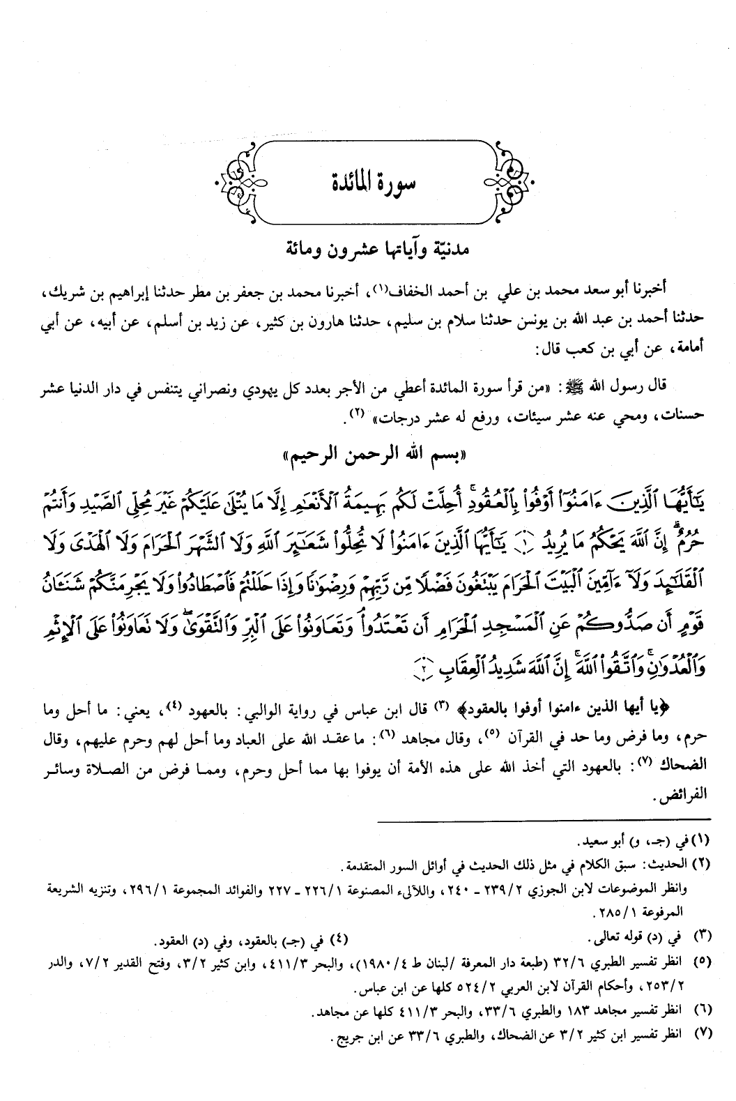 بسم الله الرحمن الرحيم {يَأَيُّهَا الَّذِينَ آمَنُوا أَوْفُوا بِالْعُقُودِ أُحِلَّتْ لَكُمْ بَهِيمَةُ الأَنْعَامِ إِلا مَا يُتْلَى عَلَيْكُمْ غَيْرَ مُحِلِّي الصَّيْدِ وَأَنْتُمْ حُرُمٌ إِنَّ اللَّهَ يَحْكُمُ مَا يُرِيدُ {1} يَأَيُّهَا الَّذِينَ آمَنُوا لا تُحِلُّوا شَعَائِرَ اللَّهِ وَلا الشَّهْرَ الْحَرَامَ وَلا الْهَدْيَ وَلا الْقَلائِدَ وَلا آمِّينَ الْبَيْتَ الْحَرَامَ يَبْتَغُونَ فَضْلا مِنْ رَبِّهِمْ وَرِضْوَانًا وَإِذَا حَلَلْتُمْ فَاصْطَادُوا وَلا يَجْرِمَنَّكُمْ شَنَآنُ قَوْمٍ أَنْ صَدُّوكُمْ عَنِ الْمَسْجِدِ الْحَرَامِ أَنْ تَعْتَدُوا وَتَعَاوَنُوا عَلَى الْبِرِّ وَالتَّقْوَى وَلا تَعَاوَنُوا عَلَى الإِثْمِ وَالْعُدْوَانِ وَاتَّقُوا اللَّهَ إِنَّ اللَّهَ شَدِيدُ الْعِقَابِ {2} } [المائدة: 1-2] {يَأَيُّهَا الَّذِينَ آمَنُوا أَوْفُوا بِالْعُقُودِ} [المائدة: 1] قال ابن عباس في رواية الوالبي: بالعهود يعني: ما أحل وما حرم، وما فرض وما حد في القرآن.