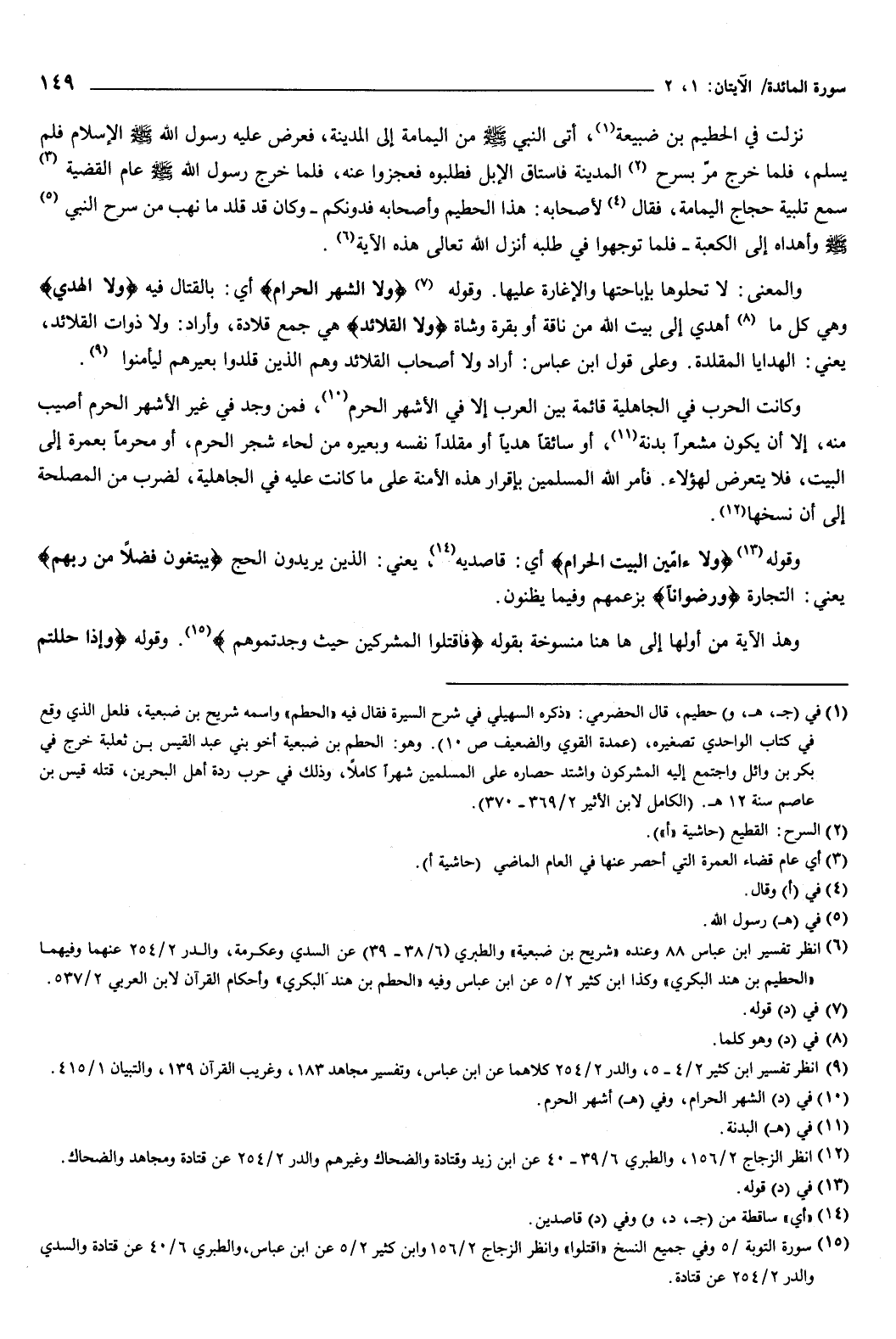 وقوله: {وَلا الشَّهْرَ الْحَرَامَ} [المائدة: 2] أي: بالقتال فيه ولا الهدي: وهي كل ما أهدي إلى بيت الله من ناقة أو بقرة وشاة ولا القلائد: هي جمع قلادة، وأراد: ولا ذوات القلائد، يعني: الهدايا المقلدة، وعلى قول ابن عباس: أراد ولا أصحاب القلائد وهم الذين قلدوا بعيرهم ليأمنوا.