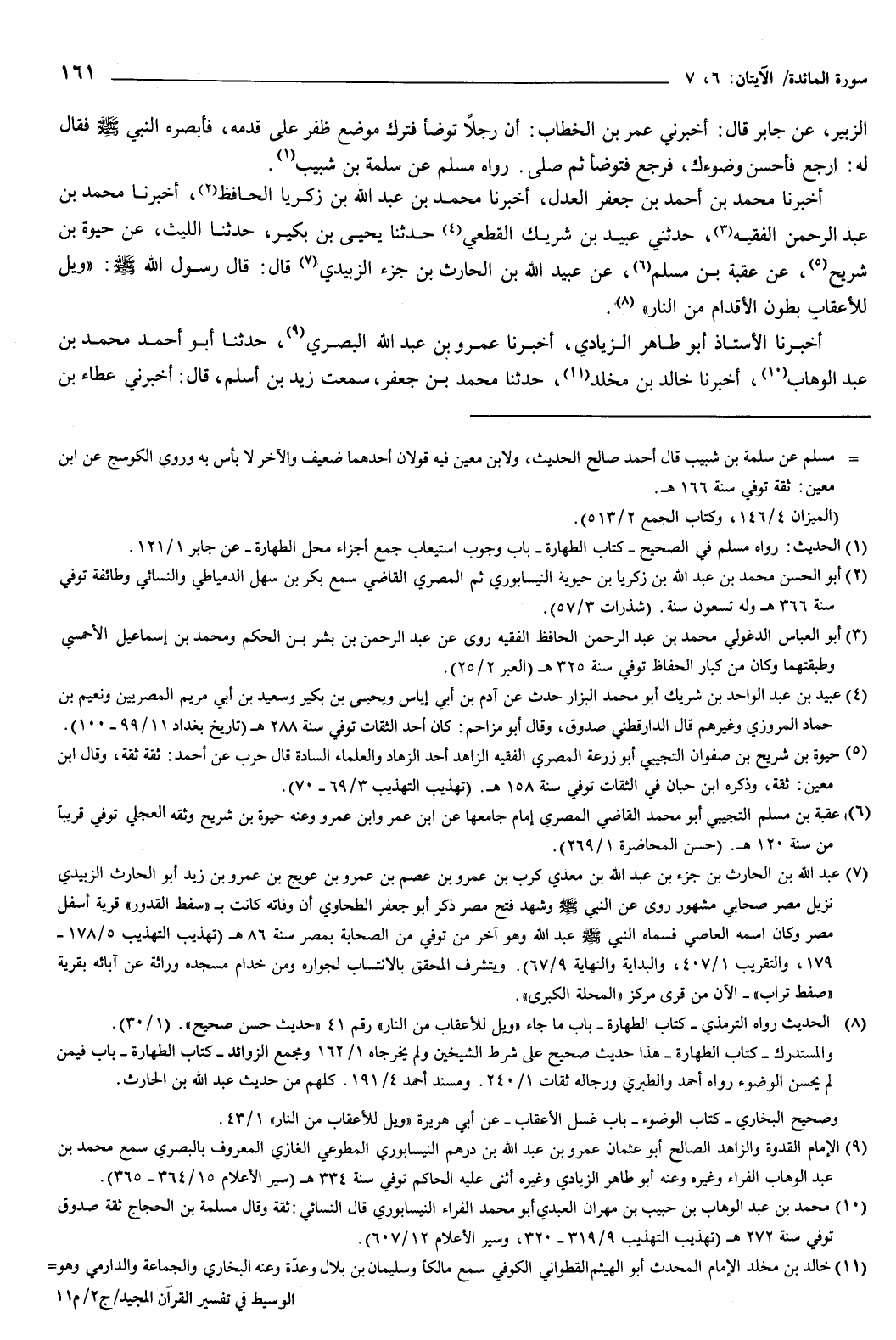 الزُّبَيْرِ، عَنْ جَابِرٍ، قَالَ: أَخْبَرَنِي عُمَرُ بْنُ الْخَطَّابِ، أَنَّ رَجُلا تَوَضَّأَ فَتَرَكَ مَوْضِعَ ظُفْرٍ عَلَى قَدَمِهِ، فَأَبْصَرَهُ النَّبِيُّ صَلَّى اللهُ عَلَيْهِ وَسَلَّمَ فَقَالَ لَهُ: «ارْجِعْ فَأَحْسِنْ وُضُوءَكَ» ، فَرَجَعَ فَتَوَضَّأَ ثُمَّ صَلَّى رَوَاهُ مُسْلِمٌ، عَنْ سَلَمَةَ بْنِ شَبِيبٍ