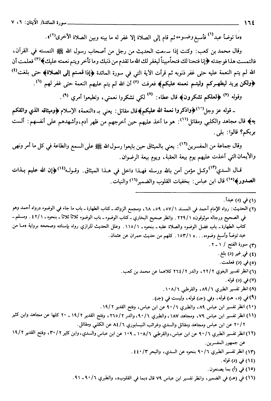 وقال محمد بن كعب: وكنت إذا سمعت الحديث من رجل من أصحاب رسول الله صَلَّى اللهُ عَلَيْهِ وَسَلَّمَ التمسته في القرآن، فالتمست هذا فوجدته: {إِنَّا فَتَحْنَا لَكَ فَتْحًا مُبِينًا {1} لِيَغْفِرَ لَكَ اللَّهُ مَا تَقَدَّمَ مِنْ ذَنْبِكَ وَمَا تَأَخَّرَ وَيُتِمَّ نِعْمَتَهُ عَلَيْكَ} [الفتح: 1-2] ، فعلمت أن الله لم يتم النعمة عليه حتى غفر ذنوبه، ثم قرأت الآية التي في { [المائدة:] إِذَا قُمْتُمْ إِلَى الصَّلاةِ} [سورة المائدة: 6] حتى بلغت {وَلَكِنْ يُرِيدُ لِيُطَهِّرَكُمْ وَلِيُتِمَّ نِعْمَتَهُ عَلَيْكُمْ} [المائدة: 6] فعرفت أن الله لم يتم عليهم النعمة حتى غفر لهم.