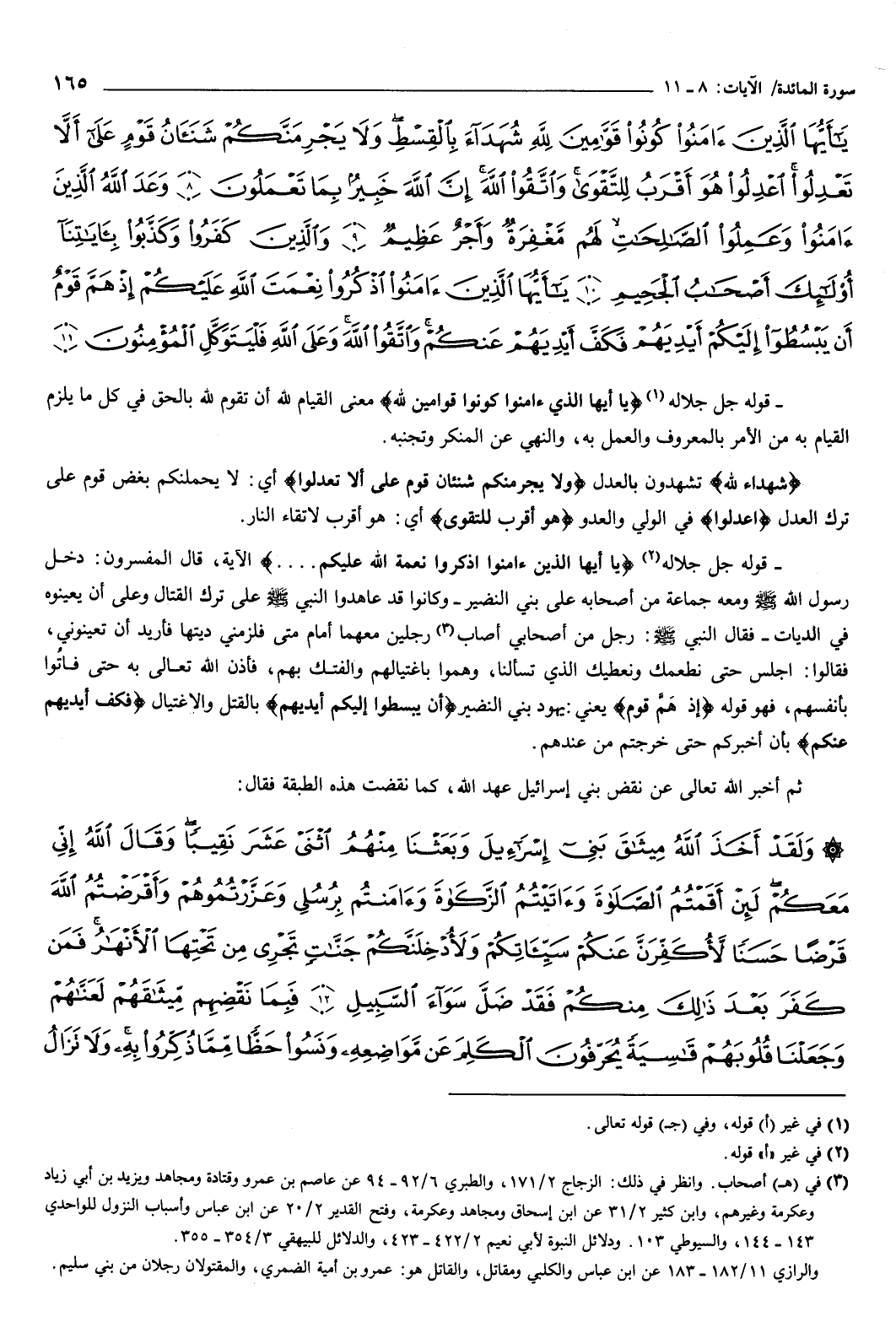 {يَأَيُّهَا الَّذِينَ آمَنُوا كُونُوا قَوَّامِينَ لِلَّهِ شُهَدَاءَ بِالْقِسْطِ وَلا يَجْرِمَنَّكُمْ شَنَآنُ قَوْمٍ عَلَى أَلَّا تَعْدِلُوا اعْدِلُوا هُوَ أَقْرَبُ لِلتَّقْوَى وَاتَّقُوا اللَّهَ إِنَّ اللَّهَ خَبِيرٌ بِمَا تَعْمَلُونَ {8} وَعَدَ اللَّهُ الَّذِينَ آمَنُوا وَعَمِلُوا الصَّالِحَاتِ لَهُمْ مَغْفِرَةٌ وَأَجْرٌ عَظِيمٌ {9} وَالَّذِينَ كَفَرُوا وَكَذَّبُوا بِآيَاتِنَا أُولَئِكَ أَصْحَابُ الْجَحِيمِ {10} يَأَيُّهَا الَّذِينَ آمَنُوا اذْكُرُوا نِعْمَتَ اللَّهِ عَلَيْكُمْ إِذْ هَمَّ قَوْمٌ أَنْ يَبْسُطُوا إِلَيْكُمْ أَيْدِيَهُمْ فَكَفَّ أَيْدِيَهُمْ عَنْكُمْ وَاتَّقُوا اللَّهَ وَعَلَى اللَّهِ فَلْيَتَوَكَّلِ الْمُؤْمِنُونَ {11} } [المائدة: 8-11] قوله جل جلاله: {يَأَيُّهَا الَّذِينَ آمَنُوا كُونُوا قَوَّامِينَ لِلَّهِ} [المائدة: 8] معنى القيام لله أن تقوم لله بالحق في كل ما يلزم القيام به من الأمر بالمعروف والعمل به، والنهي عن المنكر وتجنبه.