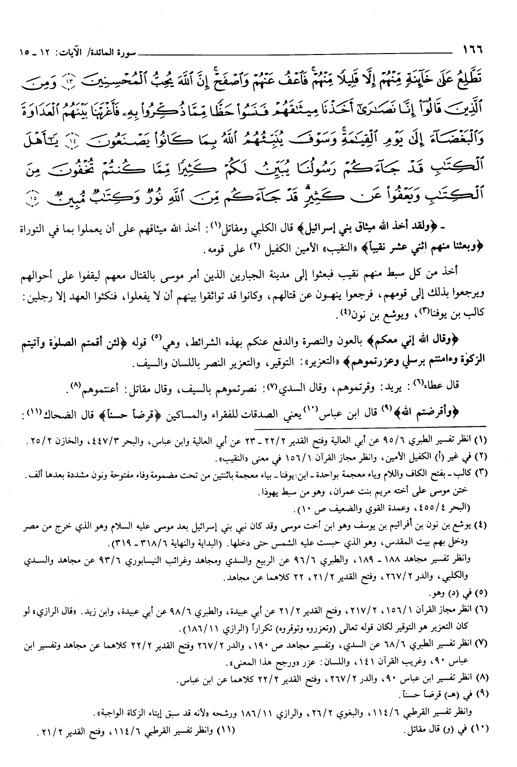 تَطَّلِعُ عَلَى خَائِنَةٍ مِنْهُمْ إِلا قَلِيلا مِنْهُمْ فَاعْفُ عَنْهُمْ وَاصْفَحْ إِنَّ اللَّهَ يُحِبُّ الْمُحْسِنِينَ {13} وَمِنَ الَّذِينَ قَالُوا إِنَّا نَصَارَى أَخَذْنَا مِيثَاقَهُمْ فَنَسُوا حَظًّا مِمَّا ذُكِّرُوا بِهِ فَأَغْرَيْنَا بَيْنَهُمُ الْعَدَاوَةَ وَالْبَغْضَاءَ إِلَى يَوْمِ الْقِيَامَةِ وَسَوْفَ يُنَبِّئُهُمُ اللَّهُ بِمَا كَانُوا يَصْنَعُونَ {14} يَأَهْلَ الْكِتَابِ قَدْ جَاءَكُمْ رَسُولُنَا يُبَيِّنُ لَكُمْ كَثِيرًا مِمَّا كُنْتُمْ تُخْفُونَ مِنَ الْكِتَابِ وَيَعْفُو عَنْ كَثِيرٍ قَدْ جَاءَكُمْ مِنَ اللَّهِ نُورٌ وَكِتَابٌ مُبِينٌ {15} } [المائدة: 12-15] {وَلَقَدْ أَخَذَ اللَّهُ مِيثَاقَ بَنِي إِسْرَائِيلَ} [المائدة: 12] قال الكلبي، ومقاتل: أخذ الله ميثاقهم على أن يعملوا بما في التوراة، {وَبَعَثْنَا مِنْهُمُ اثْنَيْ عَشَرَ نَقِيبًا} [المائدة: 12] النقيب: الأمين الكفيل على قومه.
