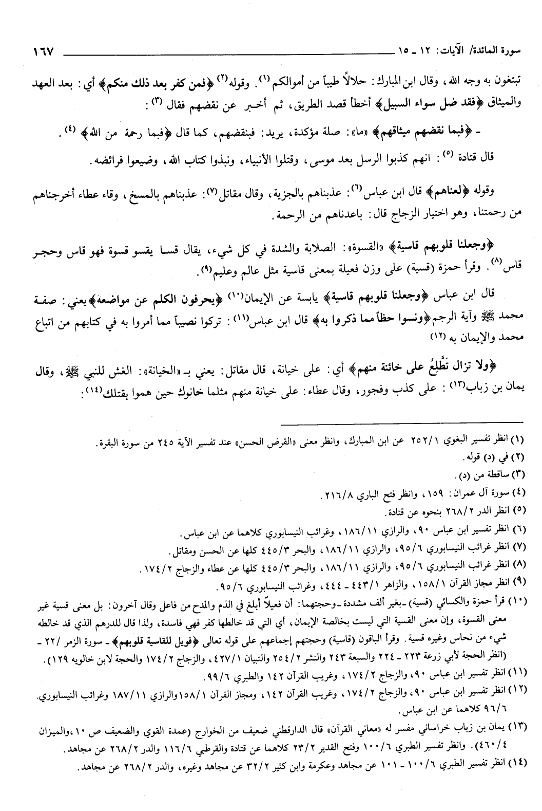 قال ابن عباس: {وَجَعَلْنَا قُلُوبَهُمْ قَاسِيَةً} [المائدة: 13] يابسة عن الإيمان {يُحَرِّفُونَ الْكَلِمَ عَنْ مَوَاضِعِهِ} [المائدة: 13] يعني: صفة محمد صَلَّى اللهُ عَلَيْهِ وَسَلَّمَ وآية الرجم {وَنَسُوا حَظًّا مِمَّا ذُكِّرُوا بِهِ} [المائدة: 13] قال ابن عباس: تركوا نصيبا مما أمروا به في كتابهم من اتباع محمد والإيمان به.