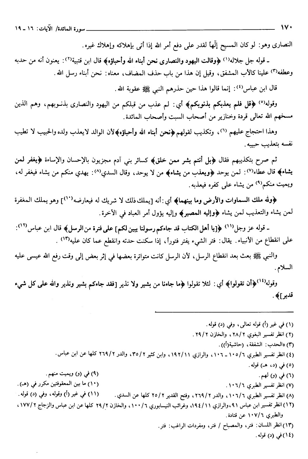 قوله جل جلاله: {وَقَالَتِ الْيَهُودُ وَالنَّصَارَى نَحْنُ أَبْنَاءُ اللَّهِ وَأَحِبَّاؤُهُ} [المائدة: 18] قال ابن قتيبة: يعنون أنه من حدبه وعطفه علينا كالأب المشفق، وقيل: إن هذا من باب حذف المضاف، معناه: نحن أبناء رسل الله.