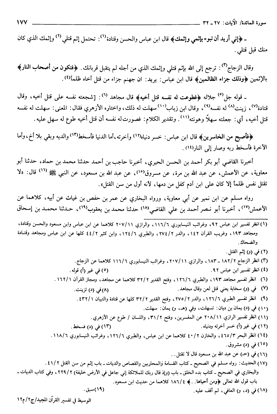 وقال الزجاج: ترجع إلى الله بإثم قتلي وإثمك الذي من أجله لم يتقبل قربانك، {فَتَكُونَ مِنْ أَصْحَابِ النَّارِ} [المائدة: 29] بالإثمين، {وَذَلِكَ جَزَاءُ الظَّالِمِينَ} [المائدة: 29] قال ابن عباس: يريد: إن جهنم جزاء من قتل أخاه ظلما.