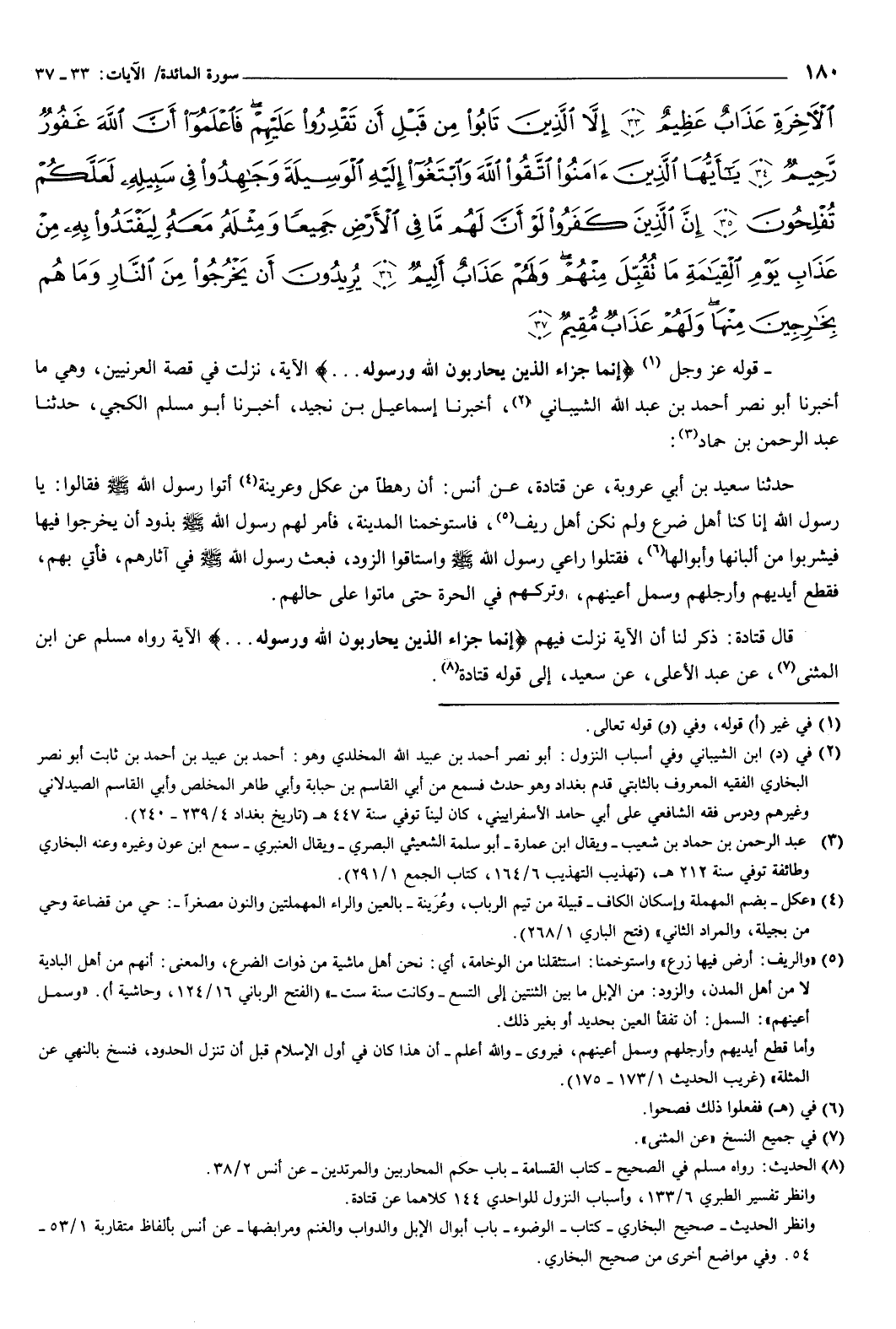 الآخِرَةِ عَذَابٌ عَظِيمٌ {33} إِلا الَّذِينَ تَابُوا مِنْ قَبْلِ أَنْ تَقْدِرُوا عَلَيْهِمْ فَاعْلَمُوا أَنَّ اللَّهَ غَفُورٌ رَحِيمٌ {34} يَأَيُّهَا الَّذِينَ آمَنُوا اتَّقُوا اللَّهَ وَابْتَغُوا إِلَيْهِ الْوَسِيلَةَ وَجَاهِدُوا فِي سَبِيلِهِ لَعَلَّكُمْ تُفْلِحُونَ {35} إِنَّ الَّذِينَ كَفَرُوا لَوْ أَنَّ لَهُمْ مَا فِي الأَرْضِ جَمِيعًا وَمِثْلَهُ مَعَهُ لِيَفْتَدُوا بِهِ مِنْ عَذَابِ يَوْمِ الْقِيَامَةِ مَا تُقُبِّلَ مِنْهُمْ وَلَهُمْ عَذَابٌ أَلِيمٌ {36} يُرِيدُونَ أَنْ يَخْرُجُوا مِنَ النَّارِ وَمَا هُمْ بِخَارِجِينَ مِنْهَا وَلَهُمْ عَذَابٌ مُقِيمٌ {37} } [المائدة: 33-37] قوله عز وجل: {إِنَّمَا جَزَاءُ الَّذِينَ يُحَارِبُونَ اللَّهَ وَرَسُولَهُ} [المائدة: 33] الآية: نزلت في قصة العرنيين، وهي ما