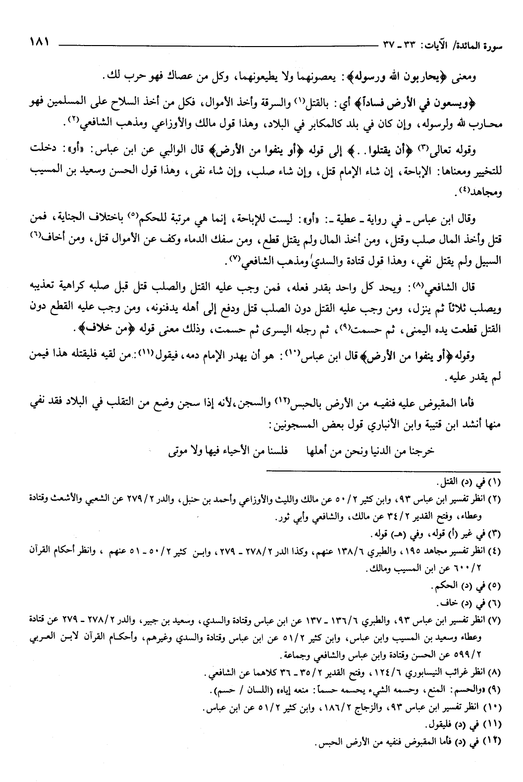 {وَيَسْعَوْنَ فِي الأَرْضِ فَسَادًا} [المائدة: 33] أي: بالقتل والسرقة وأخذ الأموال، فكل من أخذ السلاح على المسلمين فهو محارب لله ورسوله، وإن كان في بلد كالمكابر في البلاد، وهذا قول مالك، والأوزاعي، ومذهب الشافعي.