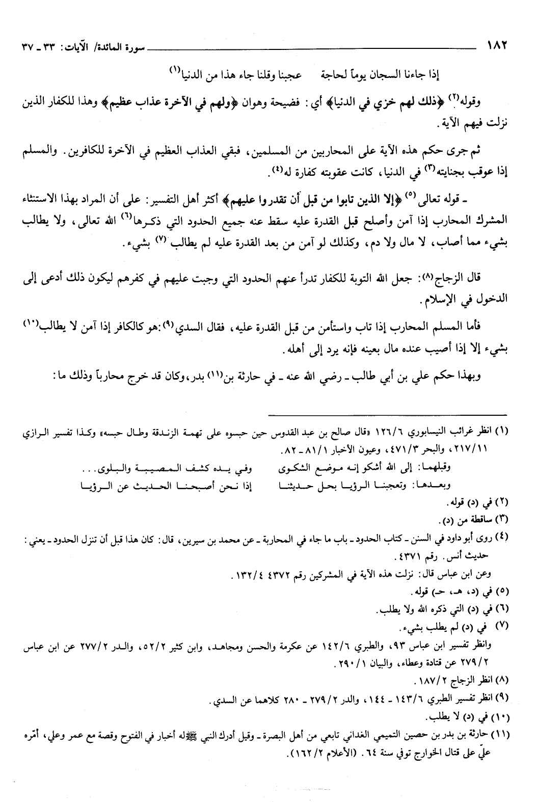 قوله تعالى: {إِلا الَّذِينَ تَابُوا مِنْ قَبْلِ أَنْ تَقْدِرُوا عَلَيْهِمْ} [المائدة: 34] أكثر أهل التفسير: على أن المراد بهذا الاستثناء المشرك المحارب إذا آمن وأصلح قبل القدرة عليه سقط عنه جميع الحدود التي ذكرها الله تعالى، ولا يطالب بشيء مما أصاب، لا مال ولا دم، وكذلك لو آمن من بعد القدرة عليه لم يطالب بشيء.