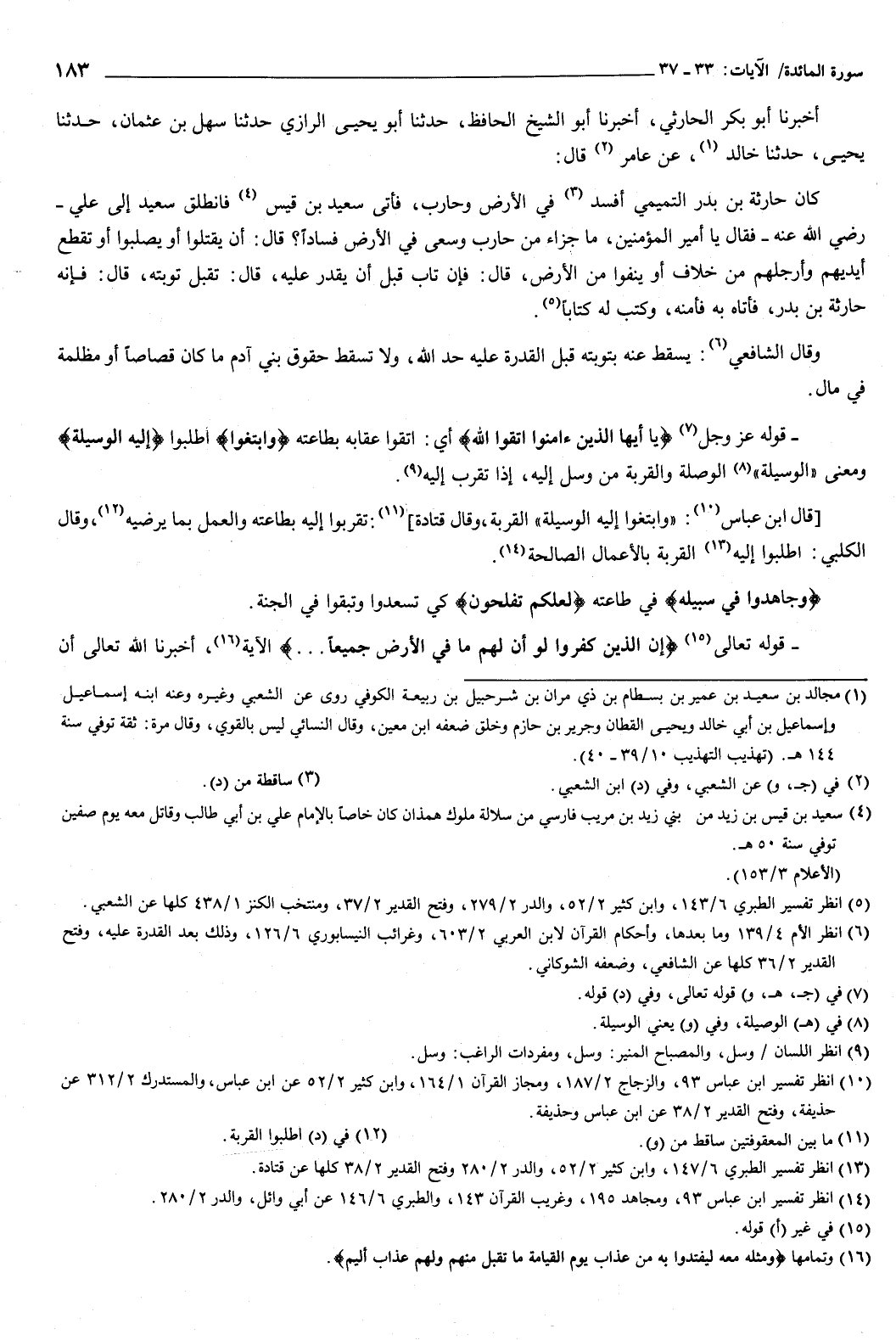 285 - أَخْبَرَنَا أَبُو بَكْرٍ الْحَارِثِيُّ، أَخْبَرَنَا أَبُو الشَّيْخِ الْحَافِظُ، حَدَّثَنَا أَبُو يَحْيَى الرَّازِيُّ، حَدَّثَنَا سَهْلُ بْنُ عُثْمَانَ، حَدَّثَنَا يَحْيَى، حَدَّثَنَا خَالِدٌ، عَنْ عَامِرٍ، قَالَ: كَانَ حَارِثَةُ بْنُ بَدْرٍ التَّمِيمِيُّ أَفْسَدَ فِي الأَرْضِ وَحَارَبَ، فَأَتَى سَعِيدَ بْنَ قَيْسٍ فَانْطَلَقَ سَعِيدٌ إِلَى عَلِيٍّ رَضِيَ اللَّهُ عَنْهُ، فَقَالَ: يَا أَمِيرَ الْمُؤْمِنِينَ مَا جَزَاءُ مَنْ حَارَبَ وَسَعَى فِي الأَرْضِ فَسَادًا؟ قَالَ: أَنْ يُقَتَّلُوا أَوْ يُصَلَّبُوا أَوْ تُقَطَّعَ أَيْدِيَهُمْ وَأَرْجُلَهُمْ مِنْ خِلافٍ أَوْ يُنْفَوْا مِنَ الأَرْضِ، قَالَ: فَإِنْ تَابَ قَبْلَ أَنْ يُقْدَرَ عَلَيْهِ، قَالَ: تُقْبَلُ تَوْبَتُه، قَالَ: فَإِنَّهُ حَارِثُ بْنُ بَدْرٍ فَأَتَاهُ بِهِ فَأَمَّنَهُ، وَكَتَبَ لَهُ كِتَابًا