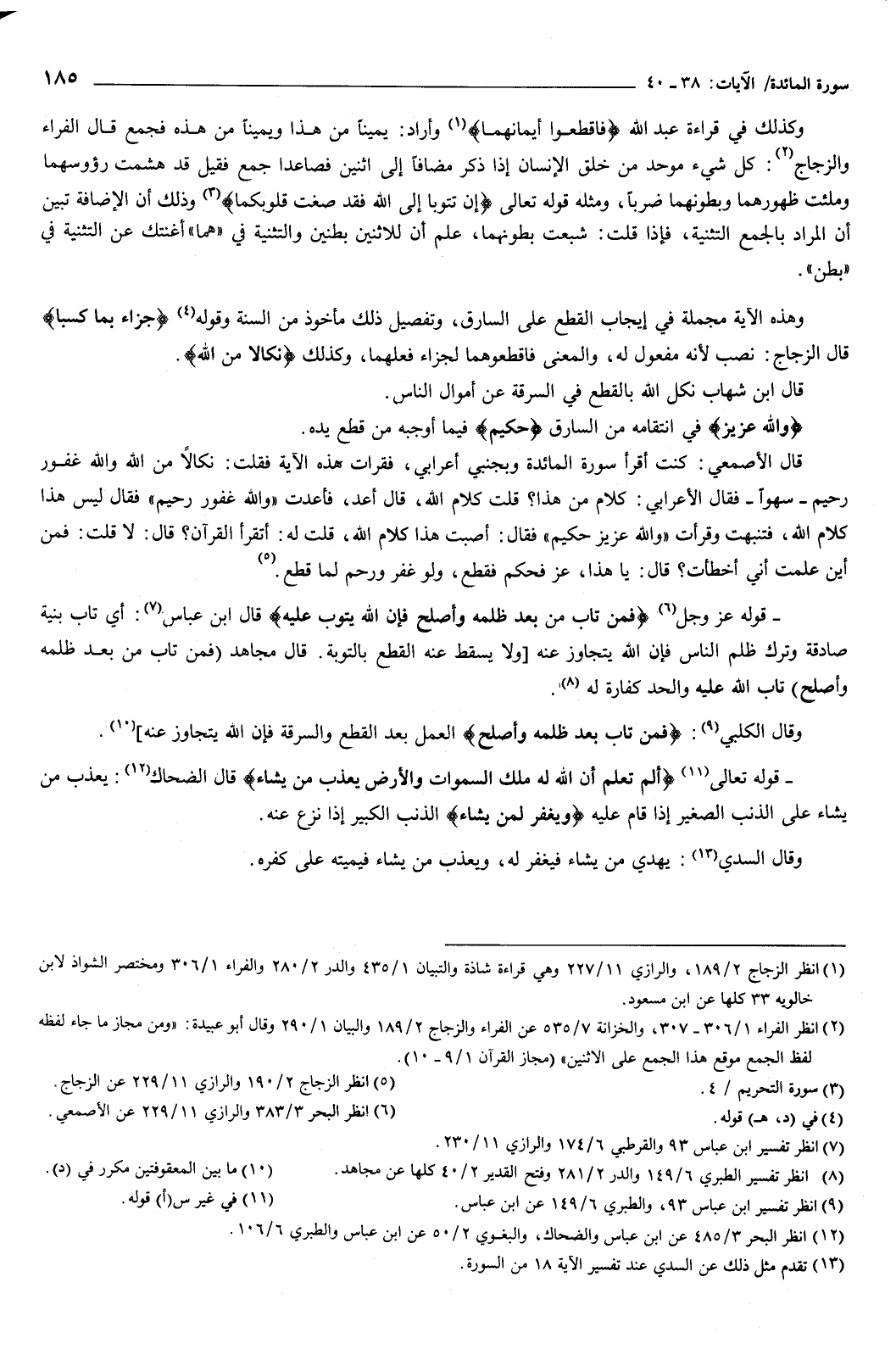 وهذه الآية مجملة في إيجاب القطع على السارق، وتفصيل ذلك مأخوذ من السنة، وقوله: {جَزَاءً بِمَا كَسَبَا} [المائدة: 38] قال الزجاج: نصب لأنه مفعول له، والمعنى: فاقطعوهما لجزاء فعلهما، وكذلك: {نَكَالا مِنَ اللَّهِ} [المائدة: 38] قال ابن شهاب: نكل الله بالقطع في السرقة عن أموال الناس.