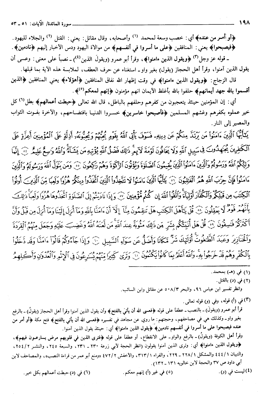 {يَأَيُّهَا الَّذِينَ آمَنُوا مَنْ يَرْتَدَّ مِنْكُمْ عَنْ دِينِهِ فَسَوْفَ يَأْتِي اللَّهُ بِقَوْمٍ يُحِبُّهُمْ وَيُحِبُّونَهُ أَذِلَّةٍ عَلَى الْمُؤْمِنِينَ أَعِزَّةٍ عَلَى الْكَافِرِينَ يُجَاهِدُونَ فِي سَبِيلِ اللَّهِ وَلا يَخَافُونَ لَوْمَةَ لائِمٍ ذَلِكَ فَضْلُ اللَّهِ يُؤْتِيهِ مَنْ يَشَاءُ وَاللَّهُ وَاسِعٌ عَلِيمٌ {54} إِنَّمَا وَلِيُّكُمُ اللَّهُ وَرَسُولُهُ وَالَّذِينَ آمَنُوا الَّذِينَ يُقِيمُونَ الصَّلاةَ وَيُؤْتُونَ الزَّكَاةَ وَهُمْ رَاكِعُونَ {55} وَمَنْ يَتَوَلَّ اللَّهَ وَرَسُولَهُ وَالَّذِينَ آمَنُوا فَإِنَّ حِزْبَ اللَّهِ هُمُ الْغَالِبُونَ {56} يَأَيُّهَا الَّذِينَ آمَنُوا لا تَتَّخِذُوا الَّذِينَ اتَّخَذُوا دِينَكُمْ هُزُوًا وَلَعِبًا مِنَ الَّذِينَ أُوتُوا الْكِتَابَ مِنْ قَبْلِكُمْ وَالْكُفَّارَ أَوْلِيَاءَ وَاتَّقُوا اللَّهَ إِنْ كُنْتُمْ مُؤْمِنِينَ {57} وَإِذَا نَادَيْتُمْ إِلَى الصَّلاةِ اتَّخَذُوهَا هُزُوًا وَلَعِبًا ذَلِكَ بِأَنَّهُمْ قَوْمٌ لا يَعْقِلُونَ {58} قُلْ يَأَهْلَ الْكِتَابِ هَلْ تَنْقِمُونَ مِنَّا إِلا أَنْ آمَنَّا بِاللَّهِ وَمَا أُنْزِلَ إِلَيْنَا وَمَا أُنْزِلَ مِنْ قَبْلُ وَأَنَّ أَكْثَرَكُمْ فَاسِقُونَ {59} قُلْ هَلْ أُنَبِّئُكُمْ بِشَرٍّ مِنْ ذَلِكَ مَثُوبَةً عِنْدَ اللَّهِ مَنْ لَعَنَهُ اللَّهُ وَغَضِبَ عَلَيْهِ وَجَعَلَ مِنْهُمُ الْقِرَدَةَ وَالْخَنَازِيرَ وَعَبَدَ الطَّاغُوتَ أُولَئِكَ شَرٌّ مَكَانًا وَأَضَلُّ عَنْ سَوَاءِ السَّبِيلِ {60} وَإِذَا جَاءُوكُمْ قَالُوا آمَنَّا وَقَدْ دَخَلُوا بِالْكُفْرِ وَهُمْ قَدْ خَرَجُوا بِهِ وَاللَّهُ أَعْلَمُ بِمَا كَانُوا يَكْتُمُونَ {61} وَتَرَى كَثِيرًا مِنْهُمْ يُسَارِعُونَ فِي الإِثْمِ وَالْعُدْوَانِ وَأَكْلِهِمُ