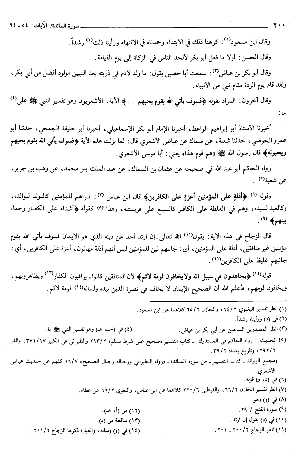 قال الزجاج في هذه الآية: يقول الله تعالى: إن ارتد أحد عن دينه الذي هو الإيمان فسوف يأتي الله بقوم مؤمنين غير منافقين، {أَذِلَّةٍ عَلَى الْمُؤْمِنِينَ} [المائدة: 54] ، أي: جانبهم لين للمؤمنين ليس أنهم أذلة مهانون، {أَعِزَّةٍ عَلَى الْكَافِرِينَ} [المائدة: 54] ، أي: جانبهم غليظ على الكافرين.