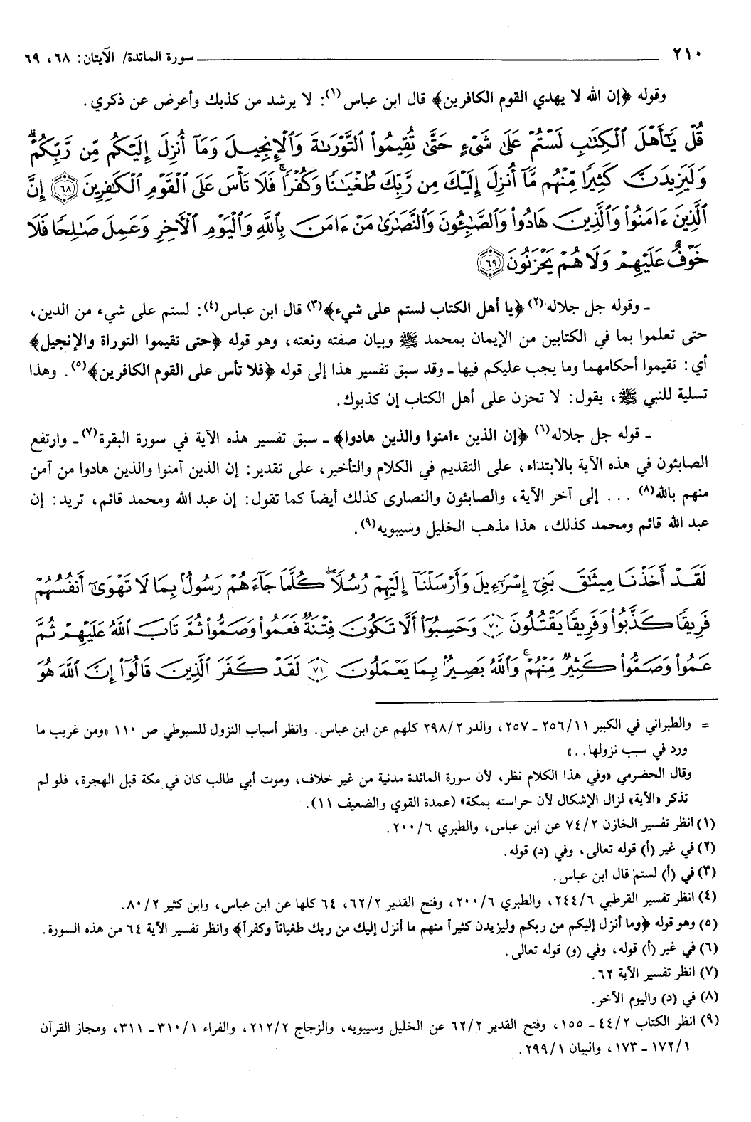 {قُلْ يَأَهْلَ الْكِتَابِ لَسْتُمْ عَلَى شَيْءٍ حَتَّى تُقِيمُوا التَّوْرَاةَ وَالإِنْجِيلَ وَمَا أُنْزِلَ إِلَيْكُمْ مِنْ رَبِّكُمْ وَلَيَزِيدَنَّ كَثِيرًا مِنْهُمْ مَا أُنْزِلَ إِلَيْكَ مِنْ رَبِّكَ طُغْيَانًا وَكُفْرًا فَلا تَأْسَ عَلَى الْقَوْمِ الْكَافِرِينَ {68} إِنَّ الَّذِينَ آمَنُوا وَالَّذِينَ هَادُوا وَالصَّابِئُونَ وَالنَّصَارَى مَنْ آمَنَ بِاللَّهِ وَالْيَوْمِ الآخِرِ وَعَمِلَ صَالِحًا فَلا خَوْفٌ عَلَيْهِمْ وَلا هُمْ يَحْزَنُونَ {69} } [المائدة: 68-69] وقوله جل جلاله: {يَأَهْلَ الْكِتَابِ لَسْتُمْ عَلَى شَيْءٍ} [المائدة: 68] قال ابن عباس: لستم على شيء من الدين، حتى تُعلموا بما في الكتابين من الإيمان بمحمد صَلَّى اللهُ عَلَيْهِ وَسَلَّمَ وبيان صفته ونعته، وهو قوله: {حَتَّى تُقِيمُوا التَّوْرَاةَ وَالإِنْجِيلَ} [المائدة: 68] أي: تقيموا أحكامهما وما يجب عليكم فيها، وقد سبق تفسير هذا إلى قوله: {فَلا تَأْسَ عَلَى الْقَوْمِ الْكَافِرِينَ} [المائدة: 68] ، وهذا تسلية للنبي صَلَّى اللهُ عَلَيْهِ وَسَلَّمَ، يقول: لا تحزن على أهل الكتاب إن كذبوك.