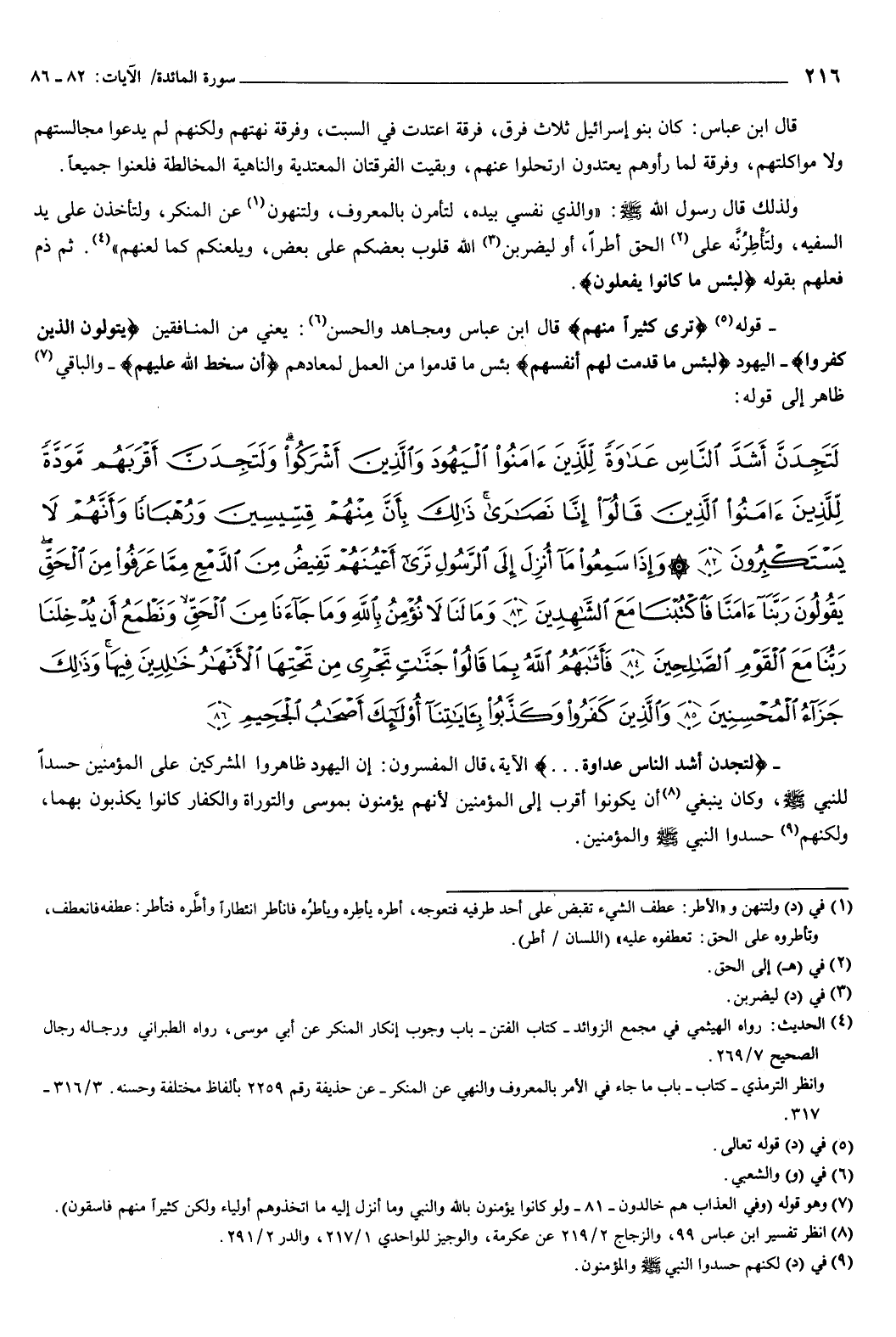 قوله: {تَرَى كَثِيرًا مِنْهُمْ} [المائدة: 80] قال ابن عباس، ومجاهد، والحسن: يعني من المنافقين {يَتَوَلَّوْنَ الَّذِينَ كَفَرُوا} [المائدة: 80] اليهود، {لَبِئْسَ مَا قَدَّمَتْ لَهُمْ أَنْفُسُهُمْ} [المائدة: 80] بئس ما قدموا من العمل لمعادهم {أَنْ سَخِطَ اللَّهُ عَلَيْهِمْ} [المائدة: 80] والباقي ظاهر إلى قوله: {لَتَجِدَنَّ أَشَدَّ النَّاسِ عَدَاوَةً لِلَّذِينَ آمَنُوا الْيَهُودَ وَالَّذِينَ أَشْرَكُوا وَلَتَجِدَنَّ أَقْرَبَهُمْ مَوَدَّةً لِلَّذِينَ آمَنُوا الَّذِينَ قَالُوا إِنَّا نَصَارَى ذَلِكَ بِأَنَّ مِنْهُمْ قِسِّيسِينَ وَرُهْبَانًا وَأَنَّهُمْ لا يَسْتَكْبِرُونَ {82} وَإِذَا سَمِعُوا مَا أُنْزِلَ إِلَى الرَّسُولِ تَرَى أَعْيُنَهُمْ تَفِيضُ مِنَ الدَّمْعِ مِمَّا عَرَفُوا مِنَ الْحَقِّ يَقُولُونَ رَبَّنَا آمَنَّا فَاكْتُبْنَا مَعَ الشَّاهِدِينَ {83} وَمَا لَنَا لا نُؤْمِنُ بِاللَّهِ وَمَا جَاءَنَا مِنَ الْحَقِّ وَنَطْمَعُ أَنْ يُدْخِلَنَا رَبُّنَا مَعَ الْقَوْمِ الصَّالِحِينَ {84} فَأَثَابَهُمُ اللَّهُ بِمَا قَالُوا جَنَّاتٍ تَجْرِي مِنْ تَحْتِهَا الأَنْهَارُ خَالِدِينَ فِيهَا وَذَلِكَ جَزَاءُ الْمُحْسِنِينَ {85} وَالَّذِينَ كَفَرُوا وَكَذَّبُوا بِآيَاتِنَا أُولَئِكَ أَصْحَابُ الْجَحِيمِ {86} } [المائدة: 82-86] {لَتَجِدَنَّ أَشَدَّ النَّاسِ عَدَاوَةً} [المائدة: 82] الآية: قال المفسرون: إن اليهود ظاهروا المشركين على المؤمنين حسدا للنبي صَلَّى اللهُ عَلَيْهِ وَسَلَّمَ، وكان ينبغي أن يكونوا أقرب إلى المؤمنين لأنهم يؤمنون بموسى والتوراة، والكفار كانوا يكذبون بهما، ولكنهم حسدوا النبي صَلَّى اللهُ عَلَيْهِ وَسَلَّمَ والمؤمنين.