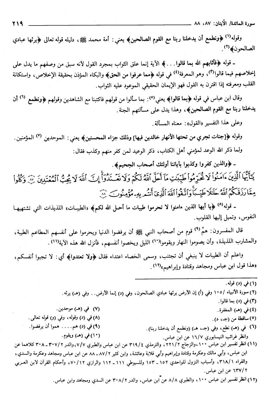 {يَأَيُّهَا الَّذِينَ آمَنُوا لا تُحَرِّمُوا طَيِّبَاتِ مَا أَحَلَّ اللَّهُ لَكُمْ وَلا تَعْتَدُوا إِنَّ اللَّهَ لا يُحِبُّ الْمُعْتَدِينَ {87} وَكُلُوا مِمَّا رَزَقَكُمُ اللَّهُ حَلالا طَيِّبًا وَاتَّقُوا اللَّهَ الَّذِي أَنْتُمْ بِهِ مُؤْمِنُونَ {88} } [المائدة: 87-88] قوله: {يَأَيُّهَا الَّذِينَ آمَنُوا لا تُحَرِّمُوا طَيِّبَاتِ مَا أَحَلَّ اللَّهُ لَكُمْ} [المائدة: 87] الطيبات: اللذيذات التي تشتهيها النفوس، وتميل إليها القلوب.