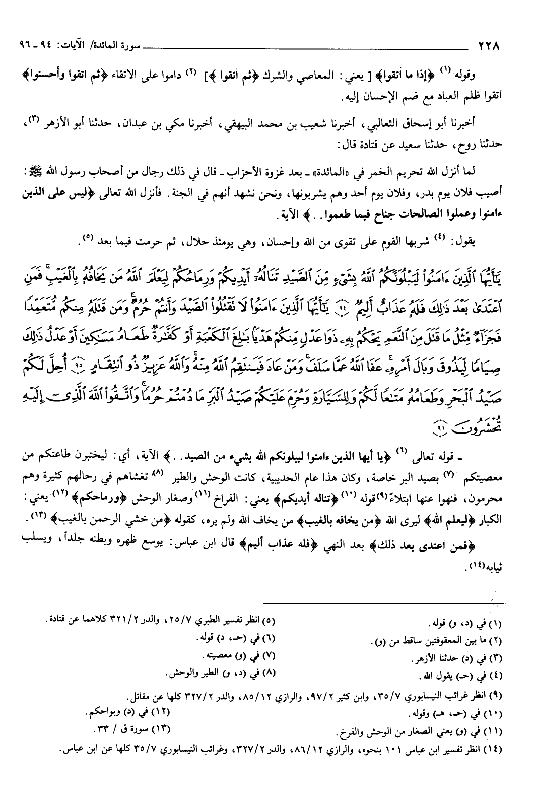 {يَأَيُّهَا الَّذِينَ آمَنُوا لَيَبْلُوَنَّكُمُ اللَّهُ بِشَيْءٍ مِنَ الصَّيْدِ تَنَالُهُ أَيْدِيكُمْ وَرِمَاحُكُمْ لِيَعْلَمَ اللَّهُ مَنْ يَخَافُهُ بِالْغَيْبِ فَمَنِ اعْتَدَى بَعْدَ ذَلِكَ فَلَهُ عَذَابٌ أَلِيمٌ {94} يَأَيُّهَا الَّذِينَ آمَنُوا لا تَقْتُلُوا الصَّيْدَ وَأَنْتُمْ حُرُمٌ وَمَنْ قَتَلَهُ مِنْكُمْ مُتَعَمِّدًا فَجَزَاءٌ مِثْلُ مَا قَتَلَ مِنَ النَّعَمِ يَحْكُمُ بِهِ ذَوَا عَدْلٍ مِنْكُمْ هَدْيًا بَالِغَ الْكَعْبَةِ أَوْ كَفَّارَةٌ طَعَامُ مَسَاكِينَ أَوْ عَدْلُ ذَلِكَ صِيَامًا لِيَذُوقَ وَبَالَ أَمْرِهِ عَفَا اللَّهُ عَمَّا سَلَفَ وَمَنْ عَادَ فَيَنْتَقِمُ اللَّهُ مِنْهُ وَاللَّهُ عَزِيزٌ ذُو انْتِقَامٍ {95} أُحِلَّ لَكُمْ صَيْدُ الْبَحْرِ وَطَعَامُهُ مَتَاعًا لَكُمْ وَلِلسَّيَّارَةِ وَحُرِّمَ عَلَيْكُمْ صَيْدُ الْبَرِّ مَا دُمْتُمْ حُرُمًا وَاتَّقُوا اللَّهَ الَّذِي إِلَيْهِ تُحْشَرُونَ {96} } [المائدة: 94-96] قوله تعالى: {يَأَيُّهَا الَّذِينَ آمَنُوا لَيَبْلُوَنَّكُمُ اللَّهُ بِشَيْءٍ مِنَ الصَّيْدِ} [المائدة: 94] الآية، أي: ليختبرن طاعتكم من معصيتكم بصيد البر خاصة، وكان هذا عام الحديبية، كانت الوحش والطير تغشاهم في رحالهم كثيرة وهم محرمون، فنهوا عنها ابتلاء قوله: تناله أيديكم يعني: الفراخ وصغار الوحش ورماحكم يعني: الكبار ليعلم الله: ليرى الله {مَنْ يَخَافُهُ بِالْغَيْبِ} [المائدة: 94] من يخاف الله ولم يره، كقوله: {مَنْ خَشِيَ الرَّحْمَنَ بِالْغَيْبِ} [ق: 33] .