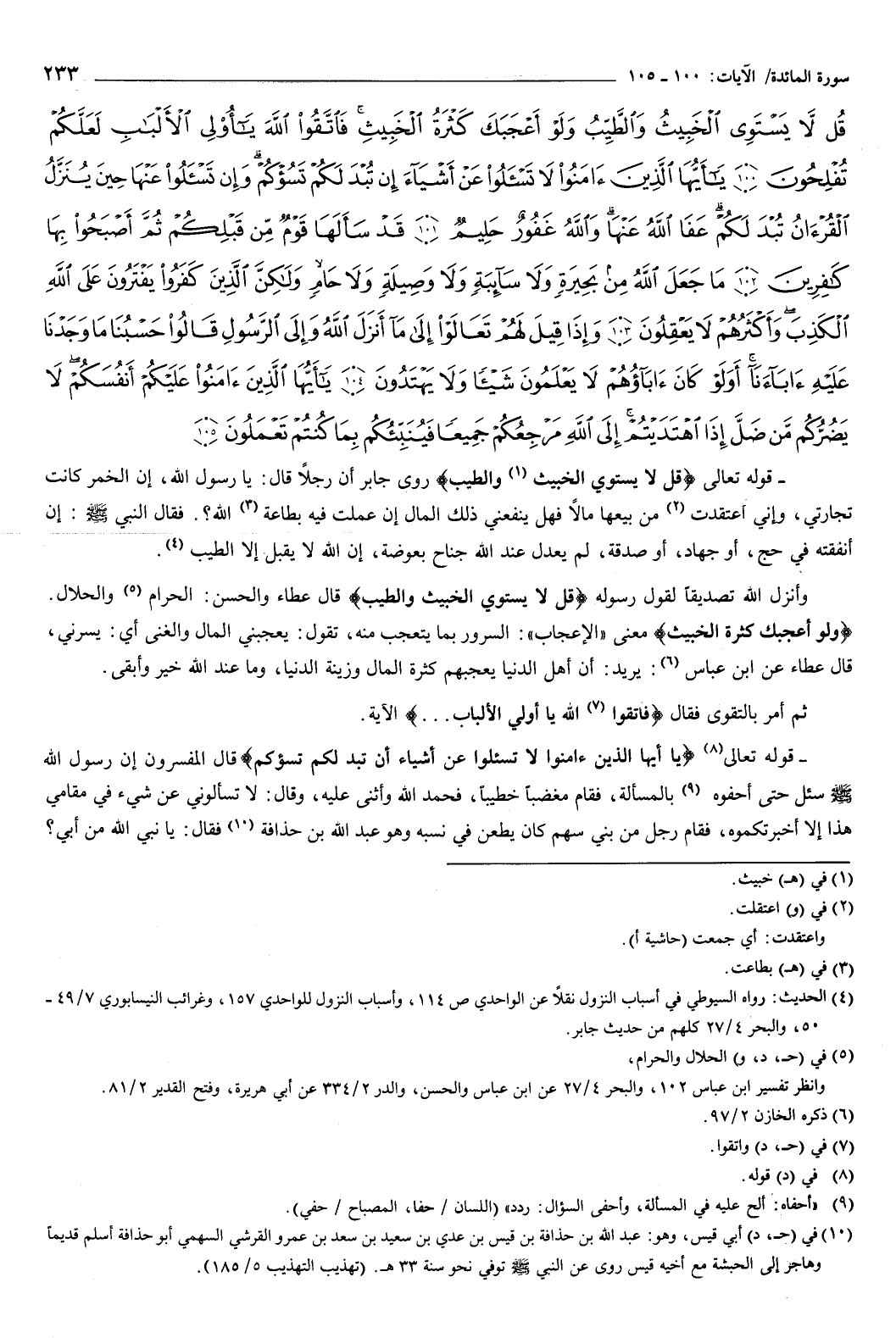 {قُلْ لا يَسْتَوِي الْخَبِيثُ وَالطَّيِّبُ وَلَوْ أَعْجَبَكَ كَثْرَةُ الْخَبِيثِ فَاتَّقُوا اللَّهَ يَا أُولِي الأَلْبَابِ لَعَلَّكُمْ تُفْلِحُونَ {100} يَأَيُّهَا الَّذِينَ آمَنُوا لا تَسْأَلُوا عَنْ أَشْيَاءَ إِنْ تُبْدَ لَكُمْ تَسُؤْكُمْ وَإِنْ تَسْأَلُوا عَنْهَا حِينَ يُنَزَّلُ الْقُرْءَانُ تُبْدَ لَكُمْ عَفَا اللَّهُ عَنْهَا وَاللَّهُ غَفُورٌ حَلِيمٌ {101} قَدْ سَأَلَهَا قَوْمٌ مِنْ قَبْلِكُمْ ثُمَّ أَصْبَحُوا بِهَا كَافِرِينَ {102} مَا جَعَلَ اللَّهُ مِنْ بَحِيرَةٍ وَلا سَائِبَةٍ وَلا وَصِيلَةٍ وَلا حَامٍ وَلَكِنَّ الَّذِينَ كَفَرُوا يَفْتَرُونَ عَلَى اللَّهِ الْكَذِبَ وَأَكْثَرُهُمْ لا يَعْقِلُونَ {103} وَإِذَا قِيلَ لَهُمْ تَعَالَوْا إِلَى مَا أَنْزَلَ اللَّهُ وَإِلَى الرَّسُولِ قَالُوا حَسْبُنَا مَا وَجَدْنَا عَلَيْهِ آبَاءَنَا أَوَلَوْ كَانَ آبَاؤُهُمْ لا يَعْلَمُونَ شَيْئًا وَلا يَهْتَدُونَ {104} يَأَيُّهَا الَّذِينَ آمَنُوا عَلَيْكُمْ أَنْفُسَكُمْ لا يَضُرُّكُمْ مَنْ ضَلَّ إِذَا اهْتَدَيْتُمْ إِلَى اللَّهِ مَرْجِعُكُمْ جَمِيعًا فَيُنَبِّئُكُمْ بِمَا كُنْتُمْ تَعْمَلُونَ {105} } [المائدة: 100-105] قوله تعالى: {قُلْ لا يَسْتَوِي الْخَبِيثُ وَالطَّيِّبُ} [المائدة: 100] روى جابر، أن رجلا قال: يا رسول الله، إن الخمر كانت تجارتي، وإني اعتقدت من بيعها مالا فهل ينفعني ذلك المال إن عملت فيه بطاعة الله، فقال النبي صَلَّى اللهُ عَلَيْهِ وَسَلَّمَ: «إن أنفقته في حج، أو جهاد، أو صدقة لم يعدل عند الله جناح بعوضة، إن الله لا يقبل إلا الطيب» .