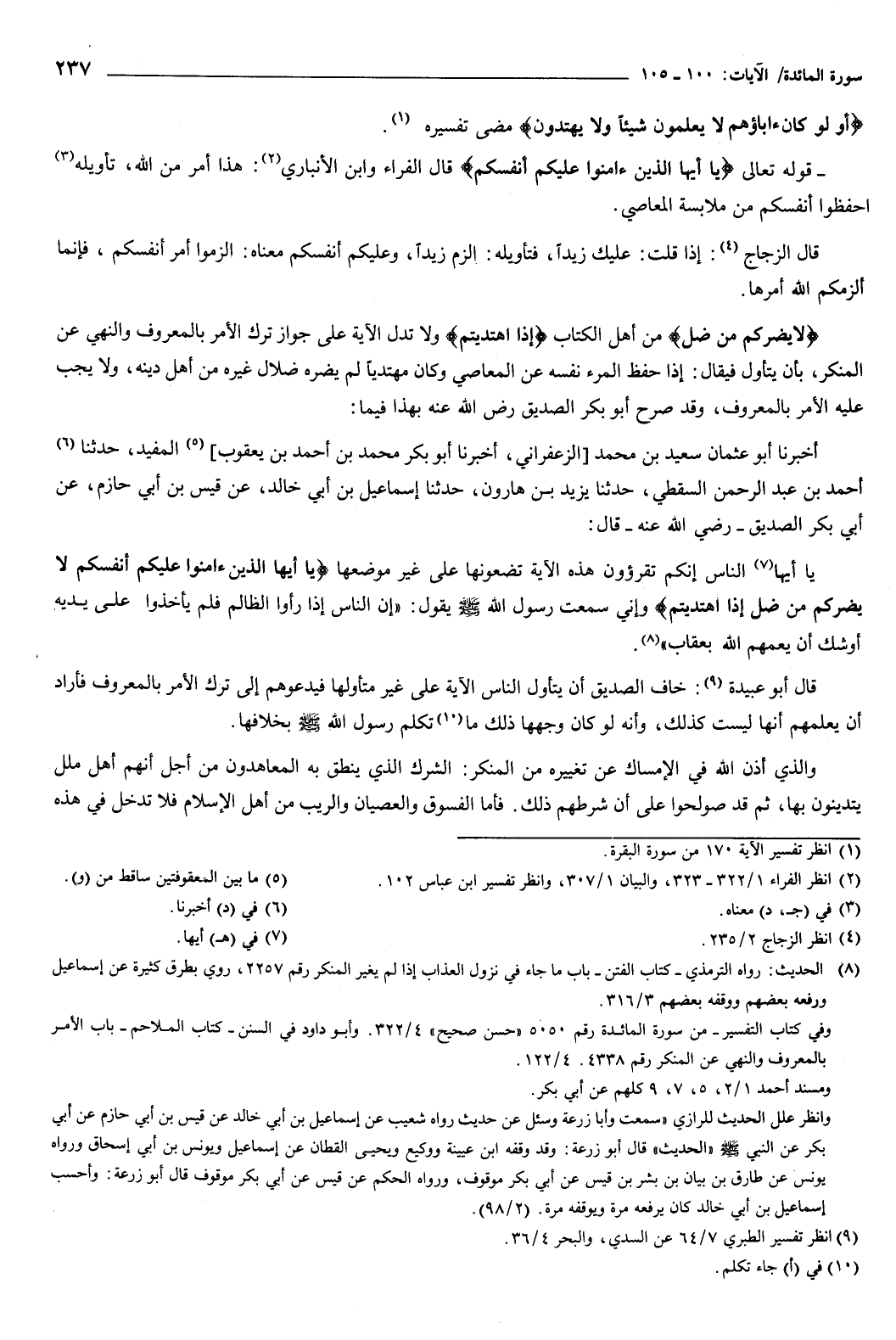 {لا يَضُرُّكُمْ مَنْ ضَلَّ} [المائدة: 105] من أهل الكتاب إذا اهتديتم، ولا تدل الآية على جواز ترك الأمر بالمعروف والنهي عن المنكر، بأن يتأول فيقال: إذا حفظ المرء نفسه عن المعاصي، وكان مهتديا لم يضره ضلال غيره من أهل دينه، ولا يجب عليه الأمر بالمعروف، وقد صرح أبو بكر الصديق رضي الله عنه بهذا فيما
