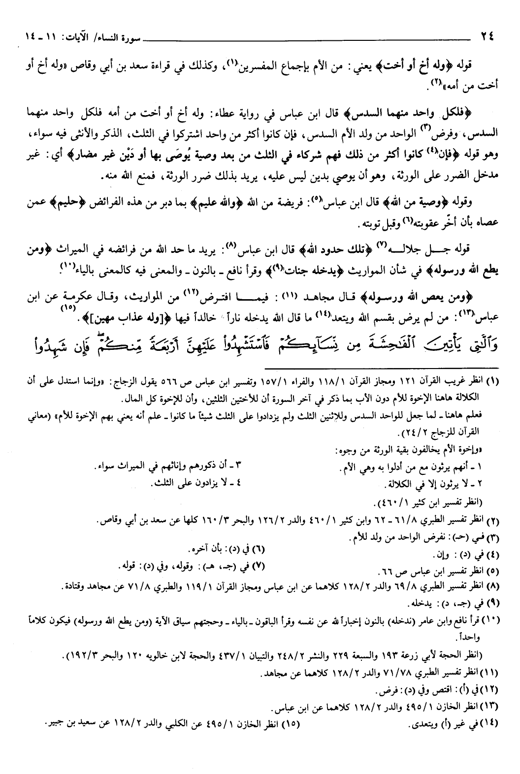 {فَلِكُلِّ وَاحِدٍ مِنْهُمَا السُّدُسُ} [النساء: 12] قَالَ ابْن عَبَّاس فِي رواية عَطَاء: وَلَهُ أخ أَوْ أخت من أُمّه فلكل واحد منهما السدس، وفرض الواحد من وُلِد الأم السدس، فَإِن كانوا أكثر من واحد اشتركوا فِي الثلث، الذكر والأنثى فِيه سواء، وَهُوَ قوله: {فَإِنْ كَانُوا أَكْثَرَ مِنْ ذَلِكَ فَهُمْ شُرَكَاءُ فِي الثُّلُثِ مِنْ بَعْدِ وَصِيَّةٍ يُوصَى بِهَا أَوْ دَيْنٍ غَيْرَ مُضَارٍّ} [النساء: 12] أَيّ: غَيْر مدخل الضرر عَلَى الورثة، وَهُوَ أن يوصي بدين لَيْسَ عَلَيْه، يريد بِذَلِك ضرر الورثة، فمنع اللَّه منه.