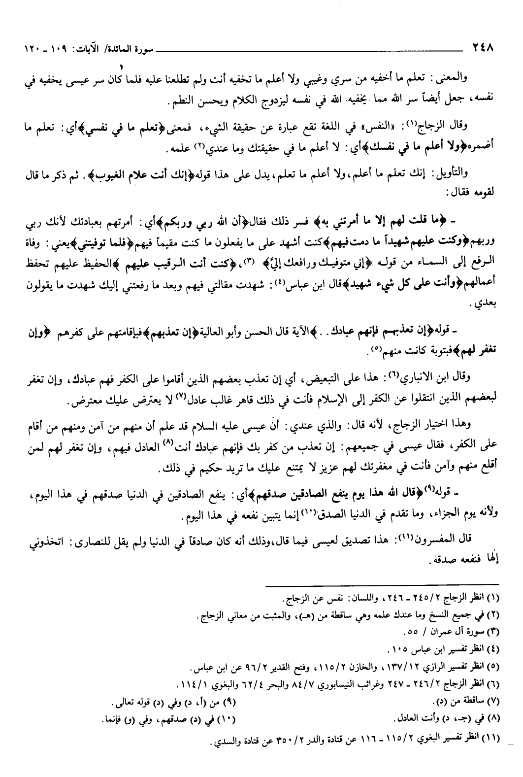 وقال الزجاج: النفس في اللغة تقع عبارة عن حقيقة الشيء، فمعنى {تَعْلَمُ مَا فِي نَفْسِي} [المائدة: 116] أي: تعلم ما أضمره {وَلا أَعْلَمُ مَا فِي نَفْسِكَ} [المائدة: 116] أي: لا أعلم ما في حقيقتك وما عندي علمه.