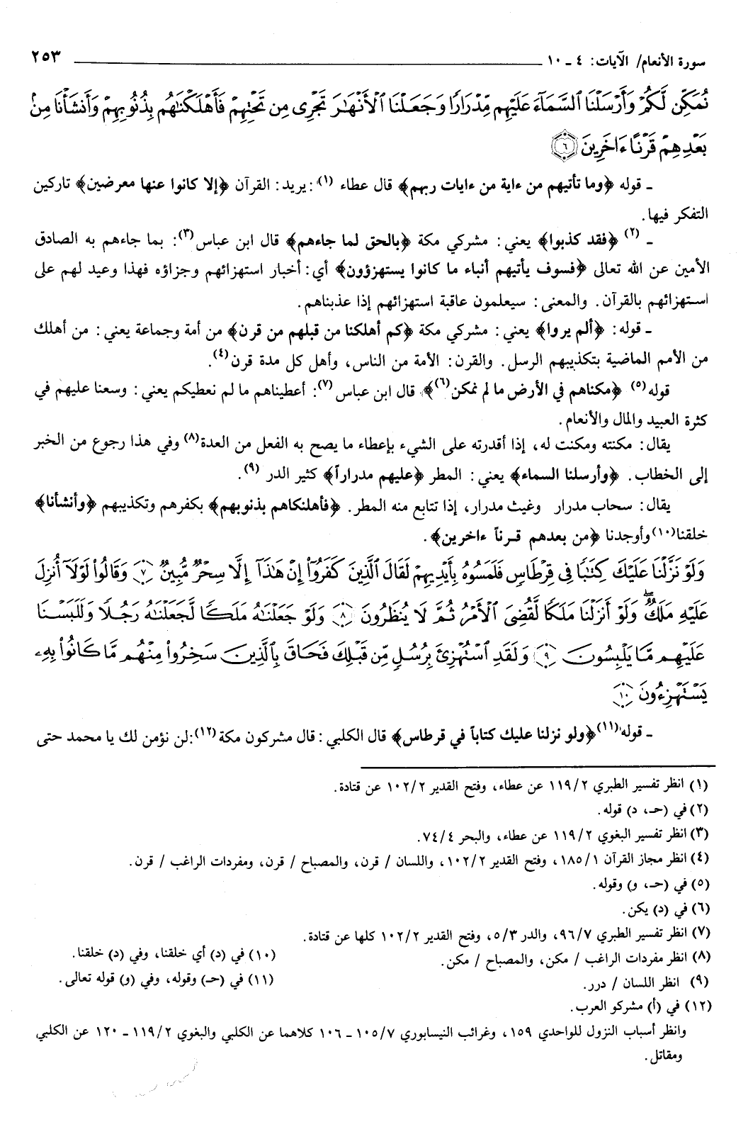 نُمَكِّنْ لَكُمْ وَأَرْسَلْنَا السَّمَاءَ عَلَيْهِمْ مِدْرَارًا وَجَعَلْنَا الأَنْهَارَ تَجْرِي مِنْ تَحْتِهِمْ فَأَهْلَكْنَاهُمْ بِذُنُوبِهِمْ وَأَنْشَأْنَا مِنْ بَعْدِهِمْ قَرْنًا آخَرِينَ {6} } [الأنعام: 4-6] قوله: {وَمَا تَأْتِيهِمْ مِنْ آيَةٍ مِنْ آيَاتِ رَبِّهِمْ} [الأنعام: 4] قال عطاء: يريد القرآن {إِلا كَانُوا عَنْهَا مُعْرِضِينَ} [الأنعام: 4] تاركين التفكر فيها.