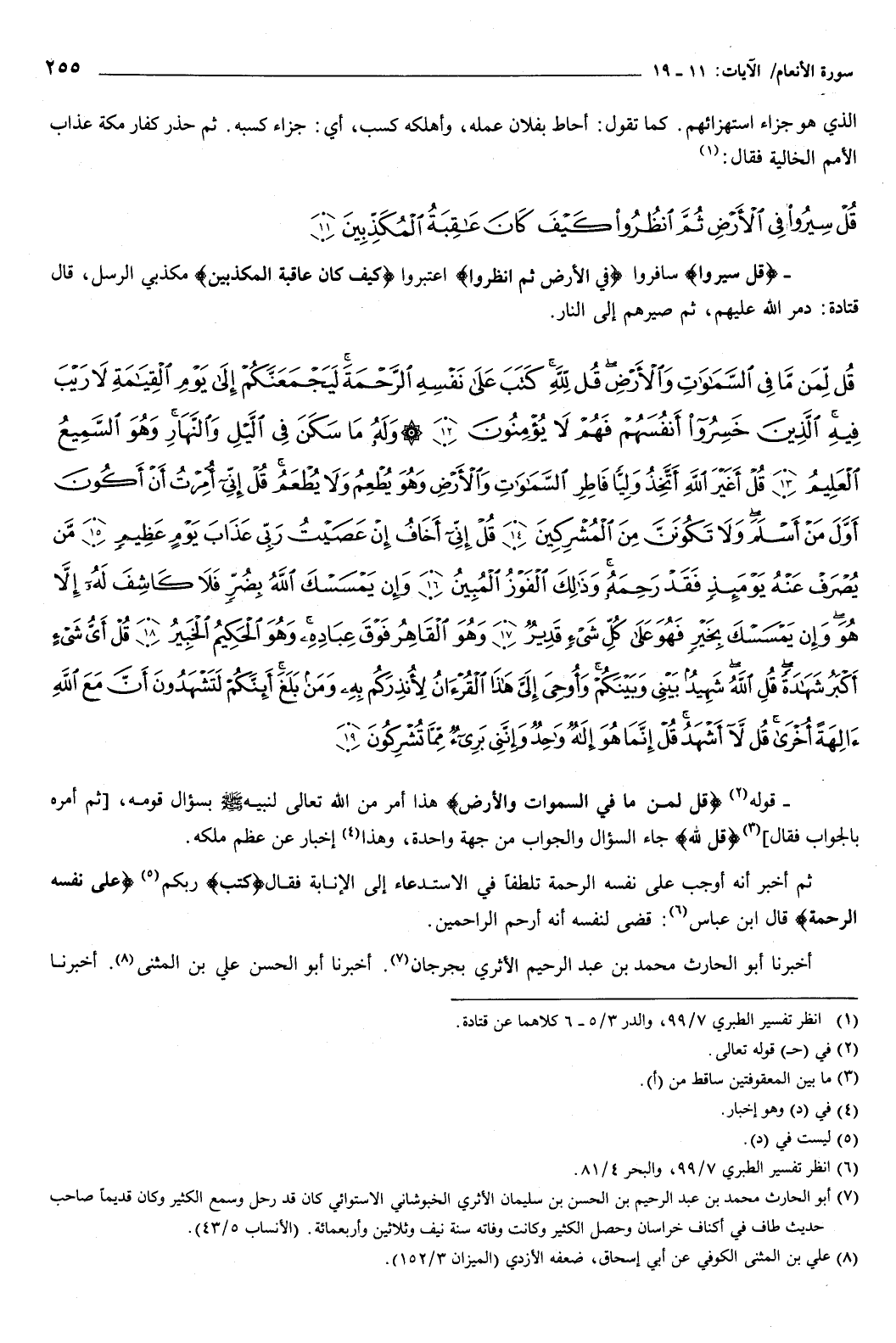 أي: جزاء كسبه، ثم حذر كفار مكة عذاب الأمم الخالية فقال: {قُلْ سِيرُوا فِي الأَرْضِ ثُمَّ انْظُرُوا كَيْفَ كَانَ عَاقِبَةُ الْمُكَذِّبِينَ} [الأنعام: 11] قل سيروا: سافِروا {فِي الأَرْضِ ثُمَّ انْظُرُوا} [الأنعام: 11] اعتبروا {كَيْفَ كَانَ عَاقِبَةُ الْمُكَذِّبِينَ} [الأنعام: 11] مكذبي الرسل، قال قتادة: دمر الله عليهم، ثم صيرهم إلى النار.