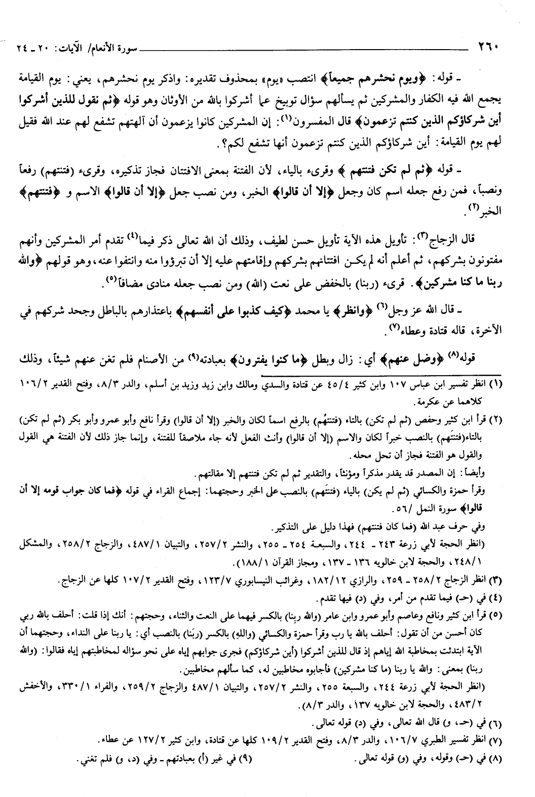 يعني: يوم القيامة يجمع الله فيه الكفار والمشركين ثم يسألهم سؤال توبيخ عما أشركوا بالله من الأوثان وهو قوله: {ثُمَّ نَقُولُ لِلَّذِينَ أَشْرَكُوا أَيْنَ شُرَكَاؤُكُمُ الَّذِينَ كُنْتُمْ تَزْعُمُونَ} [الأنعام: 22] قال المفسرون: إن المشركين كانوا يزعمون أن آلهتهم تشفع لهم عند الله، فقيل لهم يوم القيامة: أين شركاؤكم الذين كنتم تزعمون أنها تشفع لكم؟ قوله: {ثُمَّ لَمْ تَكُنْ فِتْنَتُهُمْ} [الأنعام: 23] وقرئ بالياء لأن الفتنة بمعنى الافتتان فجاز تذكيره، وقرئ فتنتهم رفعا ونصبا، فمن رفع جعله اسم كان، وجعل: {إِلا أَنْ قَالُوا} [الأنعام: 23] الخبر، ومن نصب جعل: {إِلا أَنْ قَالُوا} [الأنعام: 23] الاسم وفتنتهم الخبر.