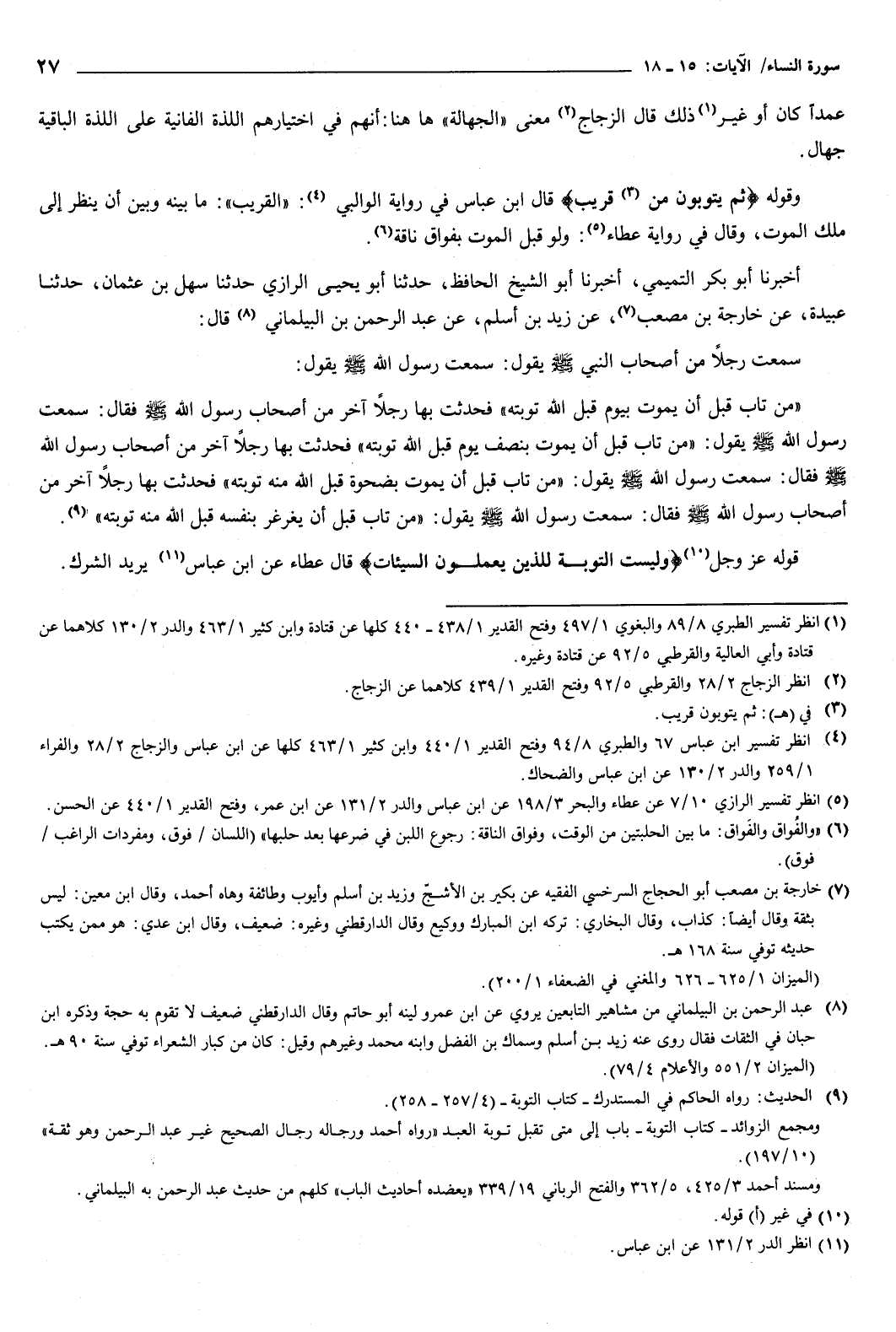 قوله عَزَّ وَجَلّ: {وَلَيْسَتِ التَّوْبَةُ لِلَّذِينَ يَعْمَلُونَ السَّيِّئَاتِ} [النساء: 18] قَالَ عَطَاء عَنْ ابْن عَبَّاس: يريد الشرك.