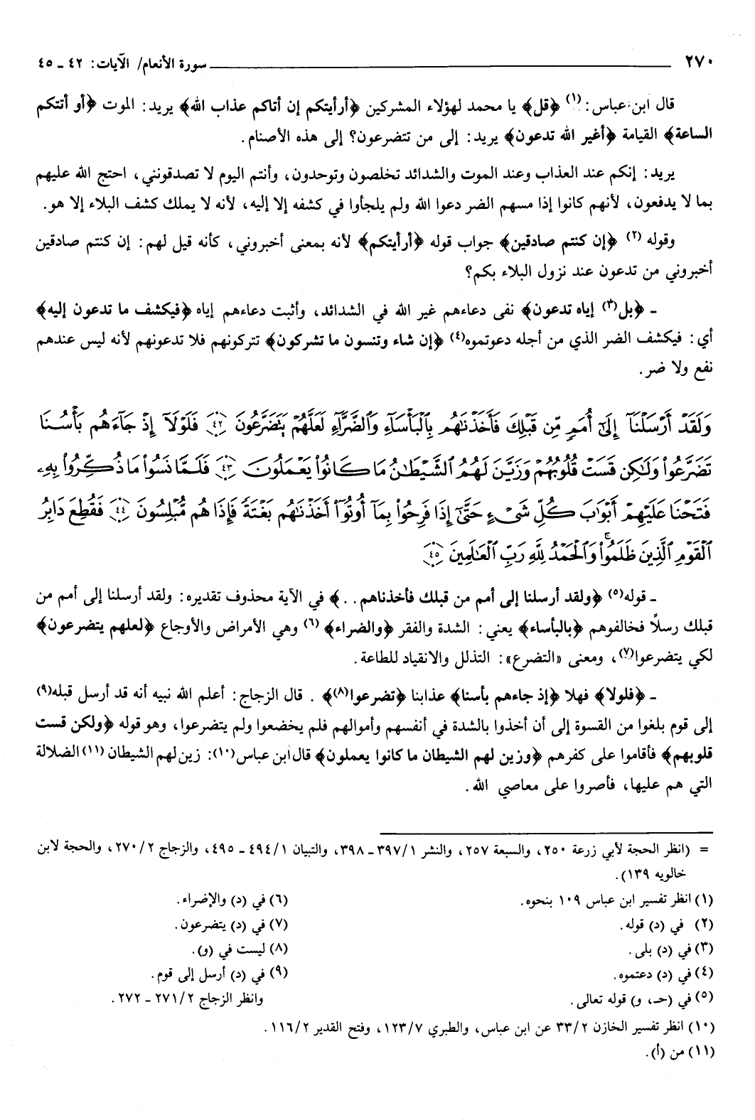 {وَلَقَدْ أَرْسَلنَا إِلَى أُمَمٍ مِنْ قَبْلِكَ فَأَخَذْنَاهُمْ بِالْبَأْسَاءِ وَالضَّرَّاءِ لَعَلَّهُمْ يَتَضَرَّعُونَ {42} فَلَوْلا إِذْ جَاءَهُمْ بَأْسُنَا تَضَرَّعُوا وَلَكِنْ قَسَتْ قُلُوبُهُمْ وَزَيَّنَ لَهُمُ الشَّيْطَانُ مَا كَانُوا يَعْمَلُونَ {43} فَلَمَّا نَسُوا مَا ذُكِّرُوا بِهِ فَتَحْنَا عَلَيْهِمْ أَبْوَابَ كُلِّ شَيْءٍ حَتَّى إِذَا فَرِحُوا بِمَا أُوتُوا أَخَذْنَاهُمْ بَغْتَةً فَإِذَا هُمْ مُبْلِسُونَ {44} فَقُطِعَ دَابِرُ الْقَوْمِ الَّذِينَ ظَلَمُوا وَالْحَمْدُ لِلَّهِ رَبِّ الْعَالَمِينَ {45} } [الأنعام: 42-45] قوله: {وَلَقَدْ أَرْسَلنَا إِلَى أُمَمٍ مِنْ قَبْلِكَ فَأَخَذْنَاهُمْ} [الأنعام: 42] في الآية محذوف تقديره: ولقد أرسلنا إلى أمم من قبلك رسلا فخالفوهم، بالبأساء يعني: الشدة والفقر، والضراء وهي الأمراض والأوجاع لعلهم يتضرعون لكي يتضرعوا، ومعنى التضرع: التذلل والانقياد للطاعة.